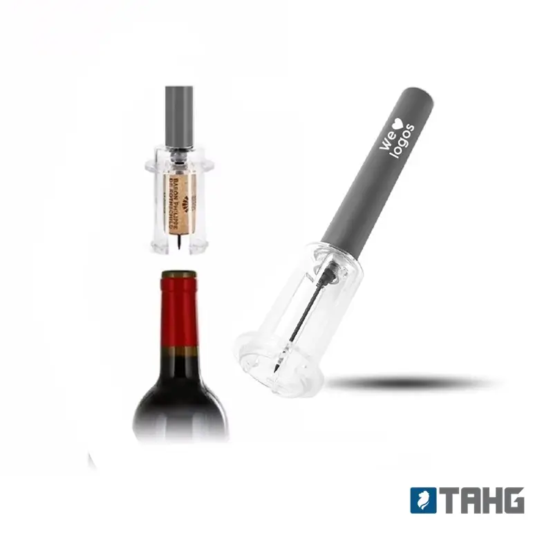 Sacacorchos neumático con caja contenedora. Se clava la aguja al corcho y se da presión al interior de la botella hasta que el corcho sale sin hacer fuerza.