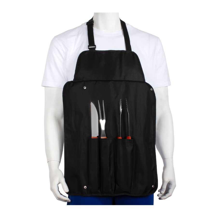 Delantal de tela raquelada negra con 3 prácticas herramientas para asado. Plegable y transformable en bolso. Fácil para bordar o imprimir.