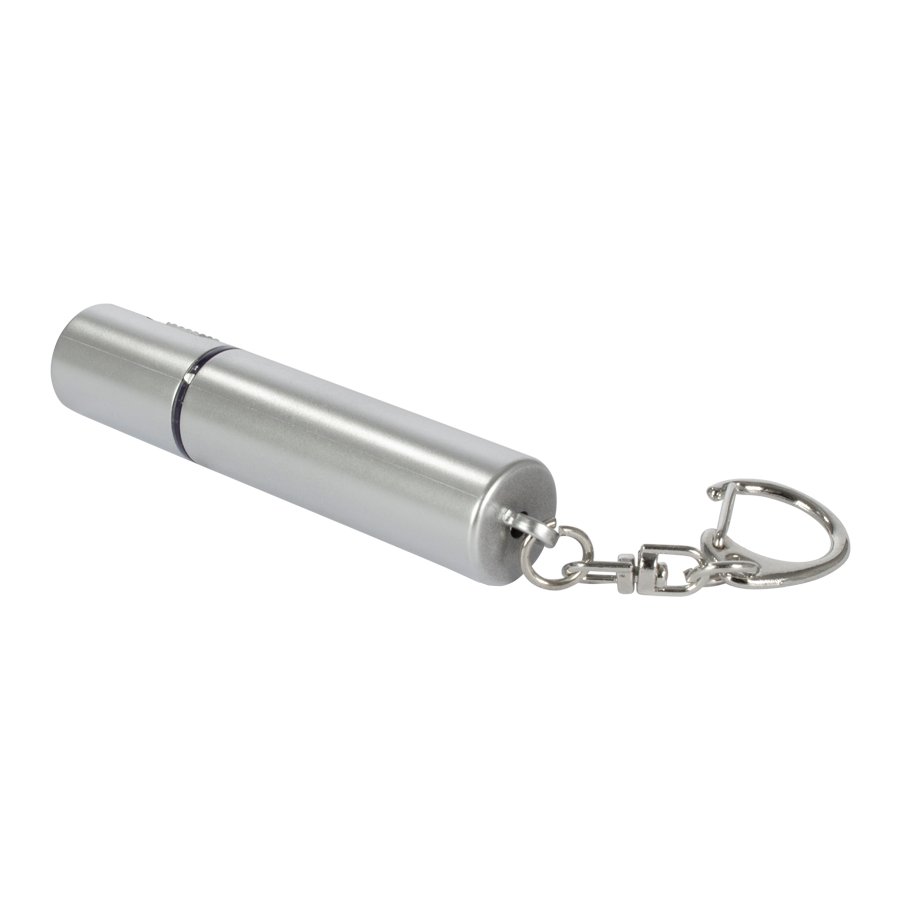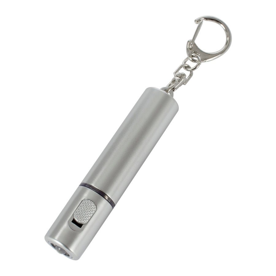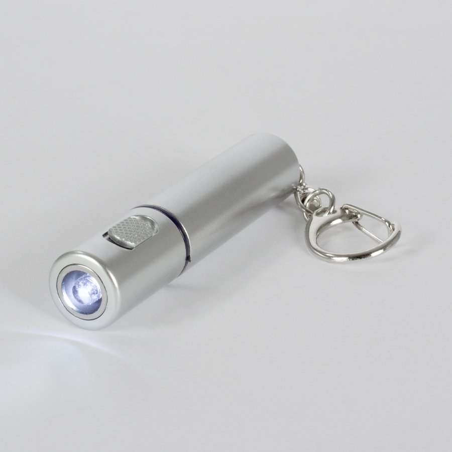 Llavero-Linterna LED plástica color plata. Usa 1 pila botón (incluida).