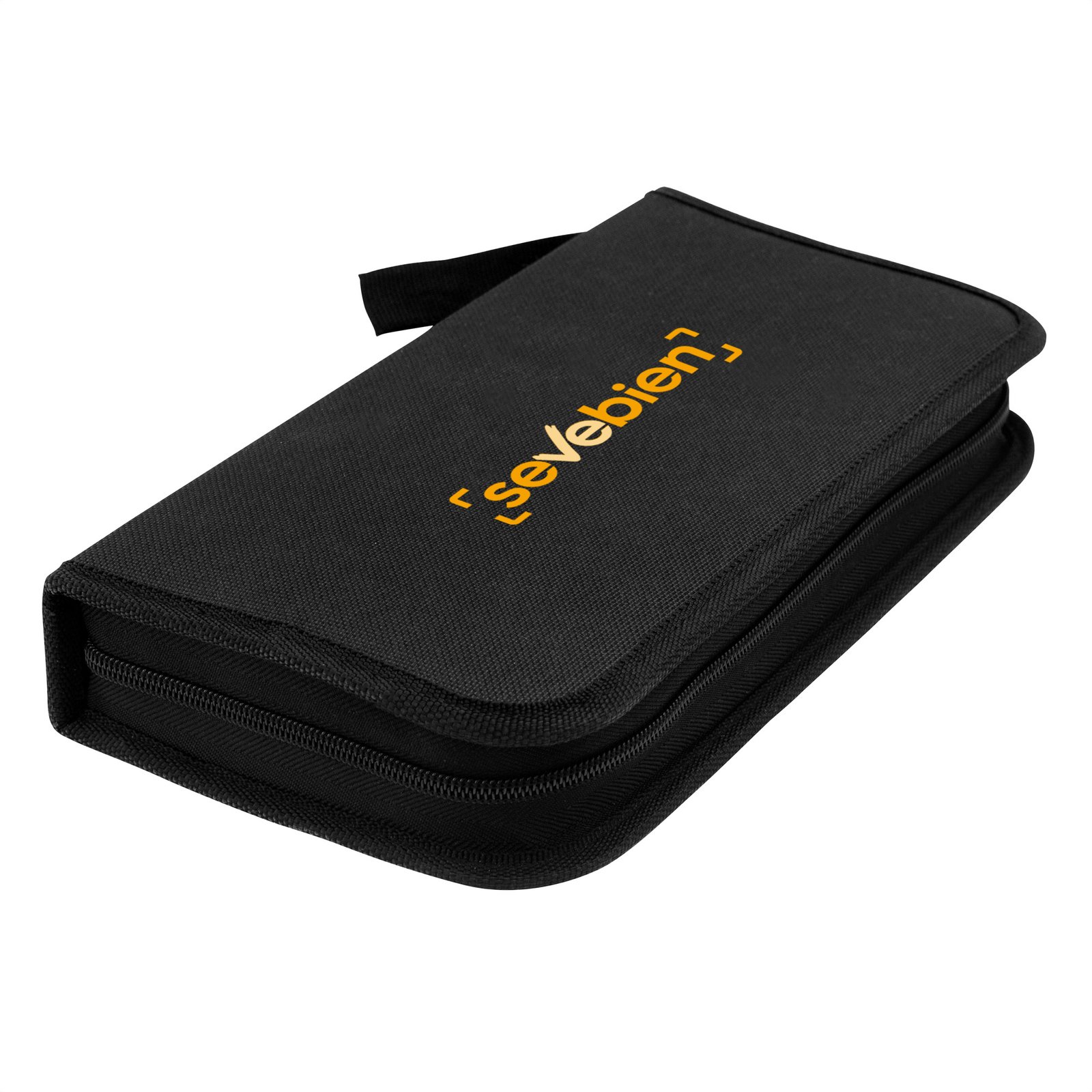 Todo lo que necesitas en un solo estuche.Set de herramientas. Contiene 12 piezas: 1 juego de 5 llaves Allen hexagonales (2, 3, 4, 5 y 6 mm.), Cutter profesional 18mm. con seguro, 2 destornilladores con diferentes puntas de 5mm (plana y phillips), 1 destornillador tester buscapolo (100-500V), martillo de uña 23 mm. y 1 pinza alicate universal 165 mm. Todas las piezas están sujetadas con elastico en estuche portable de poliéster 600D. Medidas: 28 x 14,5 x 5 cm.