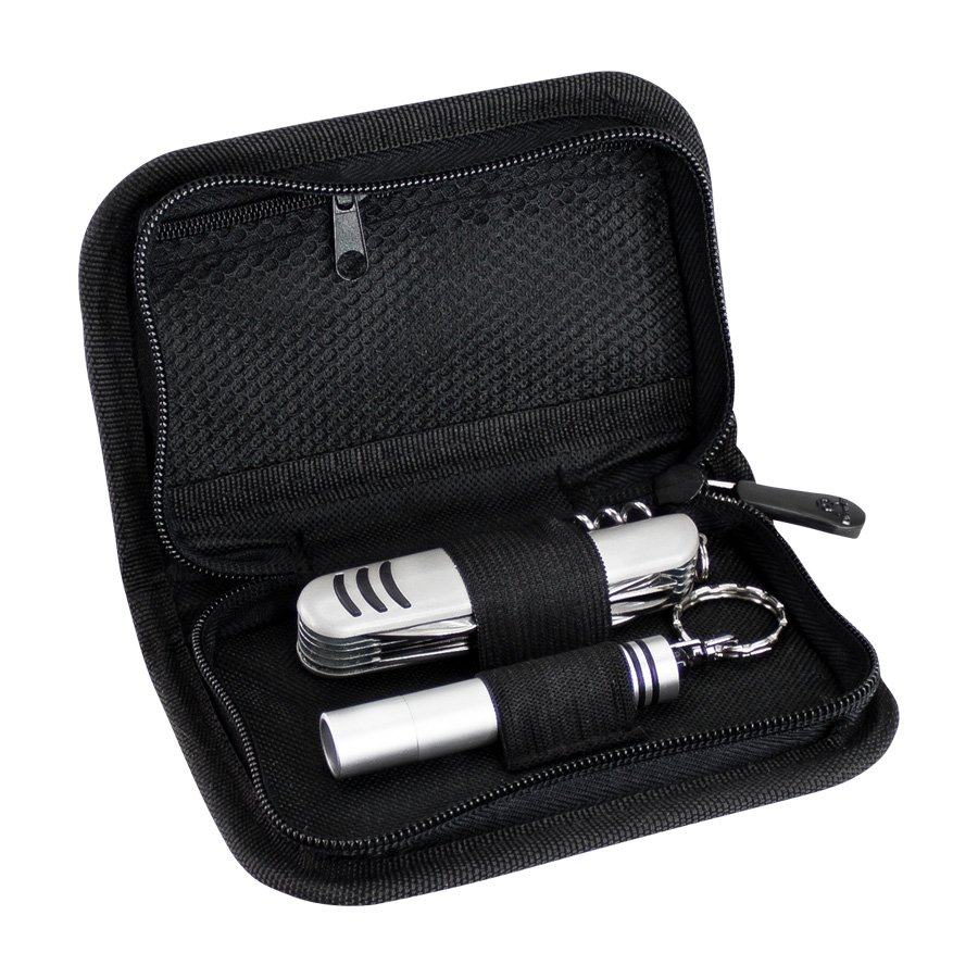 Set de Supervivencia "XD", incluye Cortapluma 12 funciones + Llavero-Linterna LED metálica de 9 cm + 3 pilas botón tipo AG3, presentación en elegante Estuche Negro con Gris.