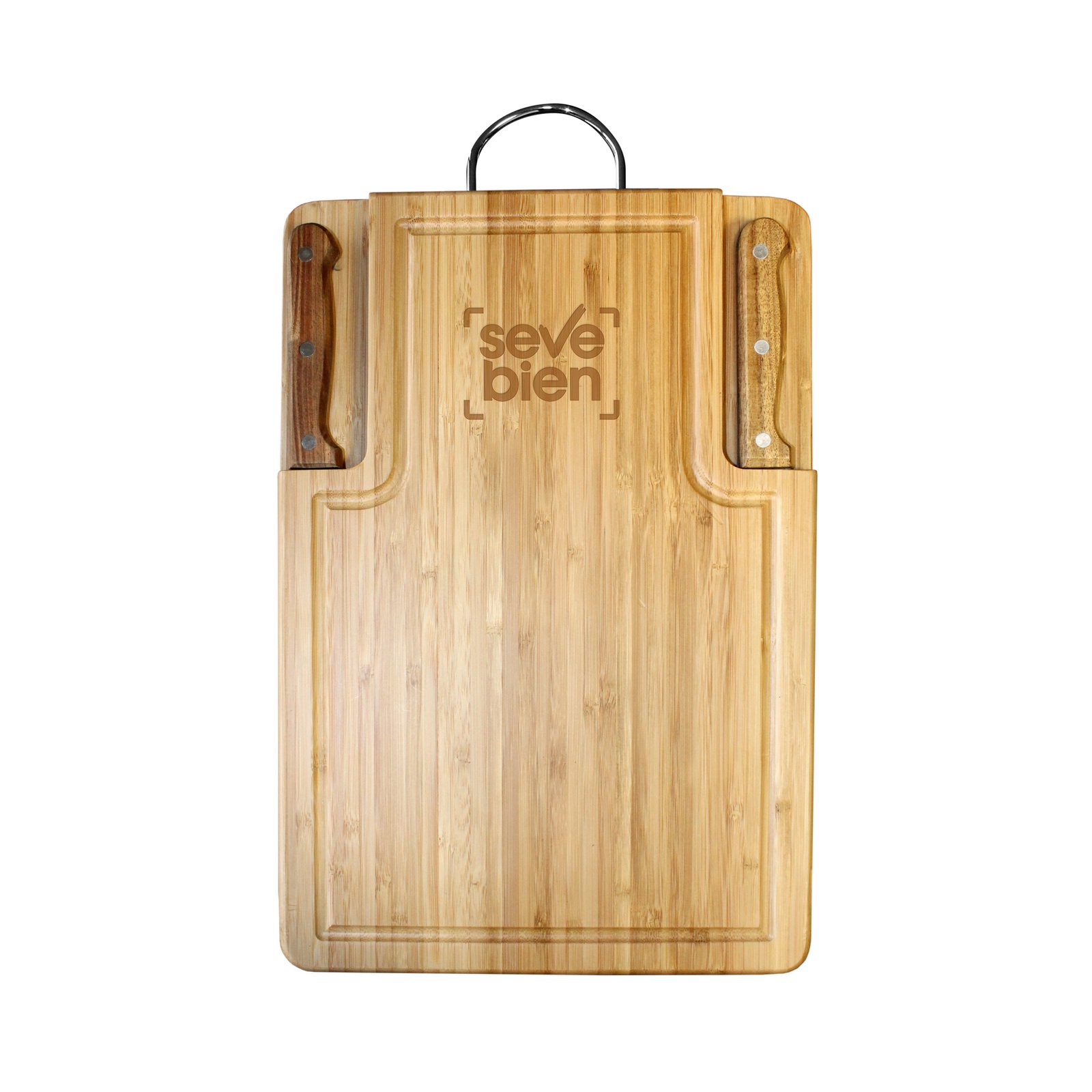 38 x 25 x 2,5 cm. Bambú. Set parrillero con tabla con manija de metal, cuchilla de 20 x 2,5 y tenedor asador de 18,5 cm con mangos de madera.Presentación en caja de regalo.