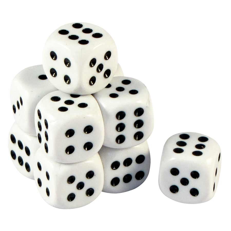 Dado de juego, extra-blanco, con puntos negros. Presentación en paquetes de 10 unidades. El valor publicado es unitario, no por bolsa.