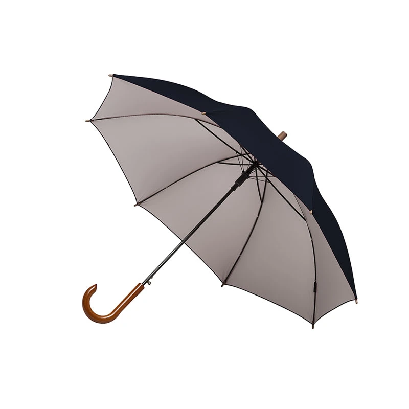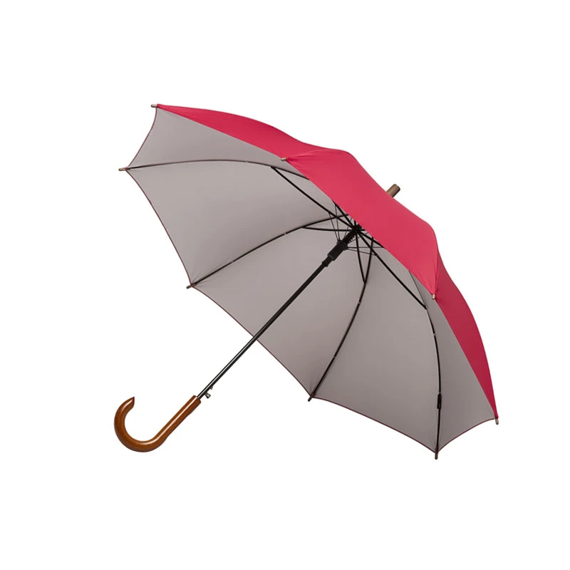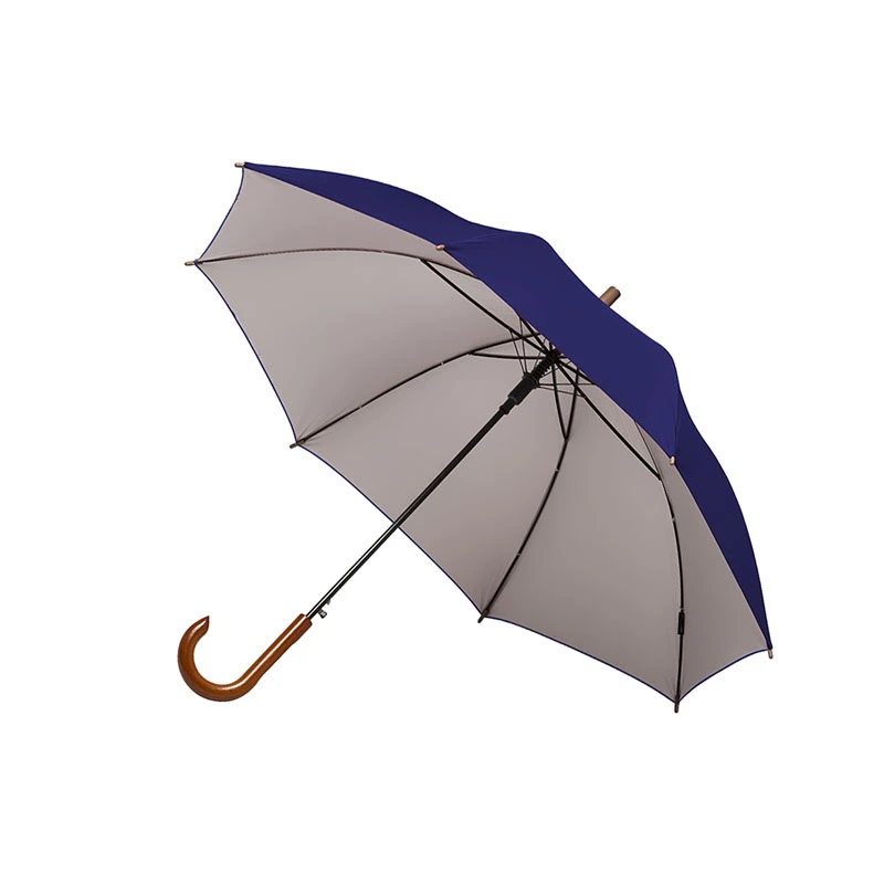 Paraguas street de 8 gajos con mango curvo de madera y estructura metálica negra. Con sistema de apertura automática. Tela de interior silver combinada con exterior en colores. Material: Pongee con interior silver. Medidas: 80 cm x Diámetro 105 cm. LOGO24: Producto disponible para el servicio de log…