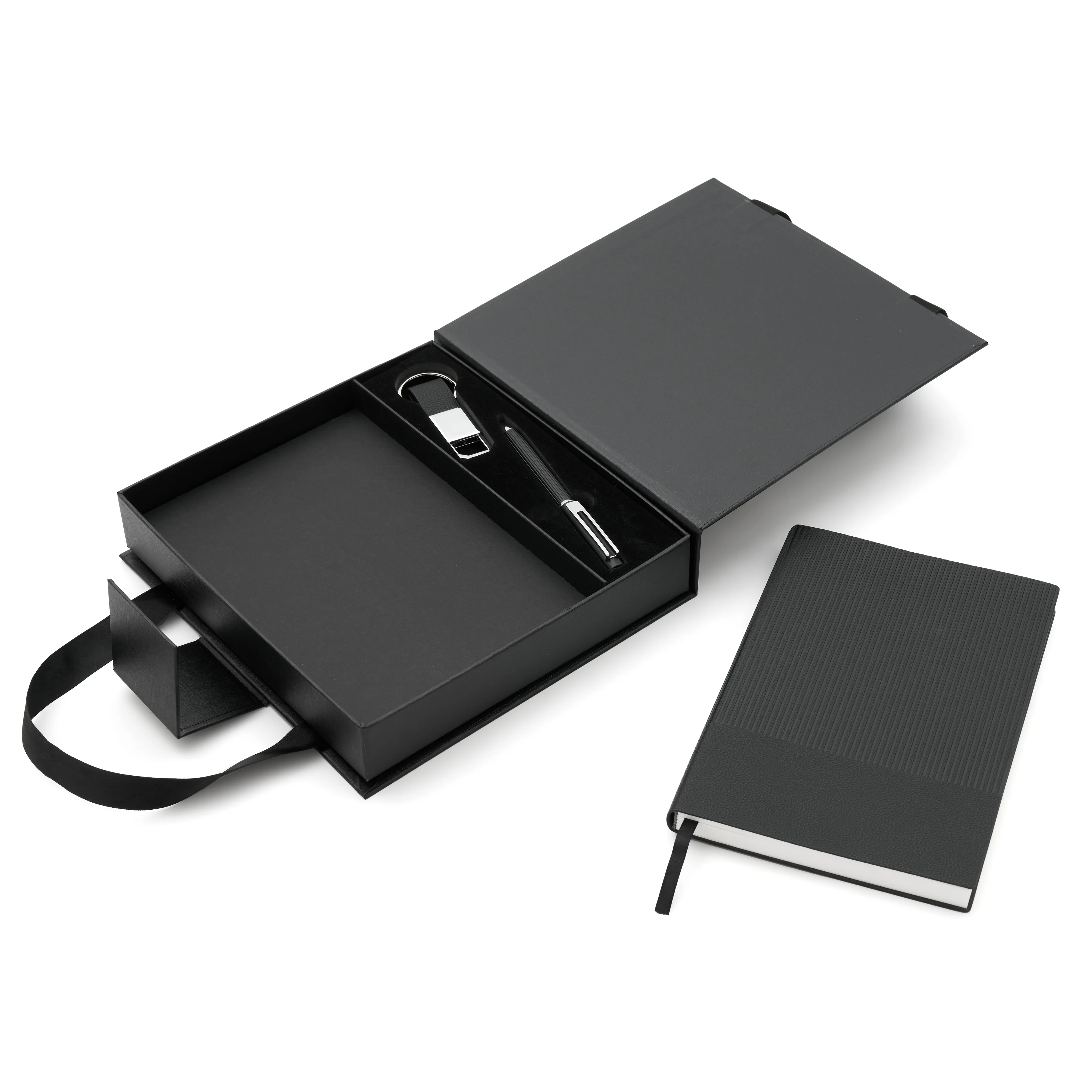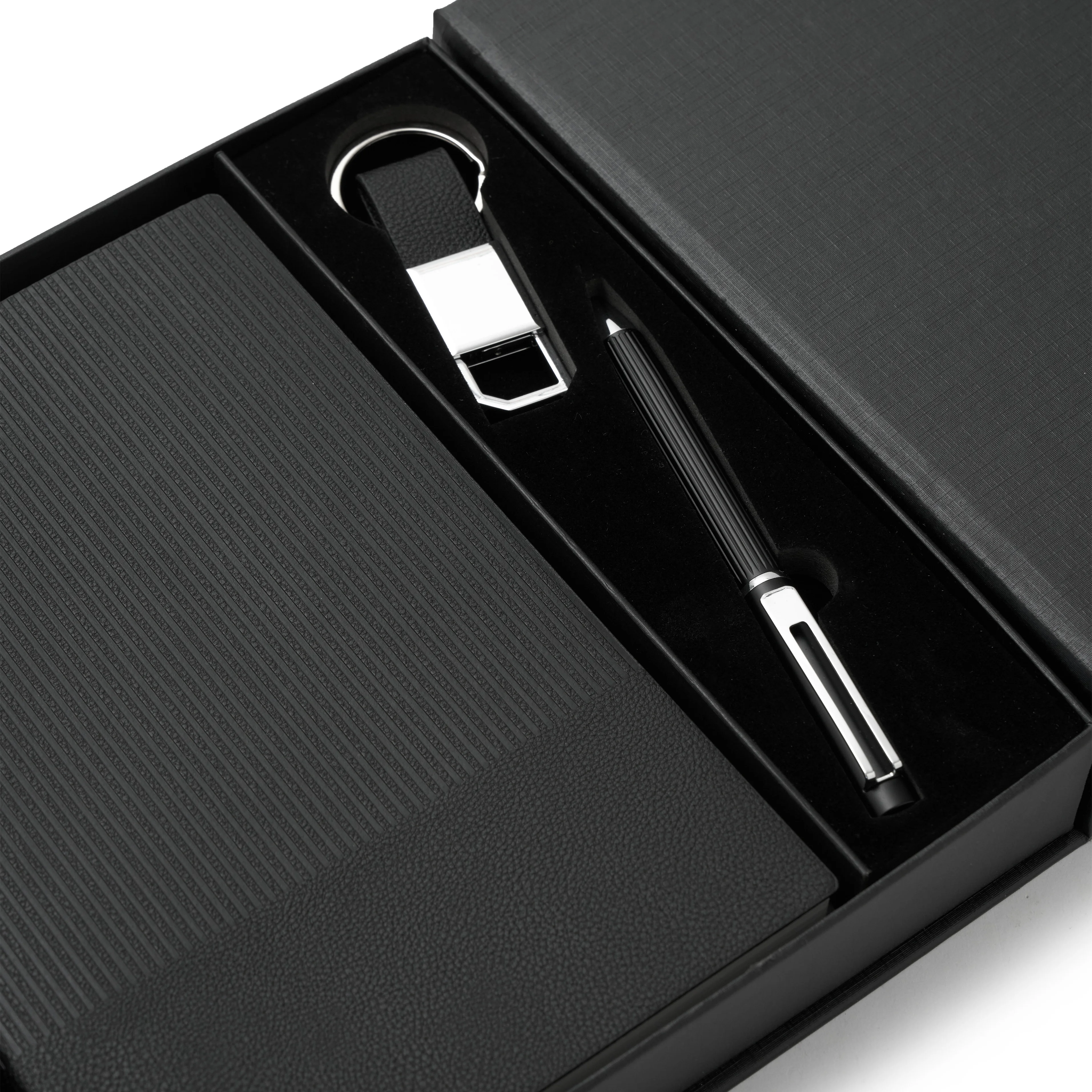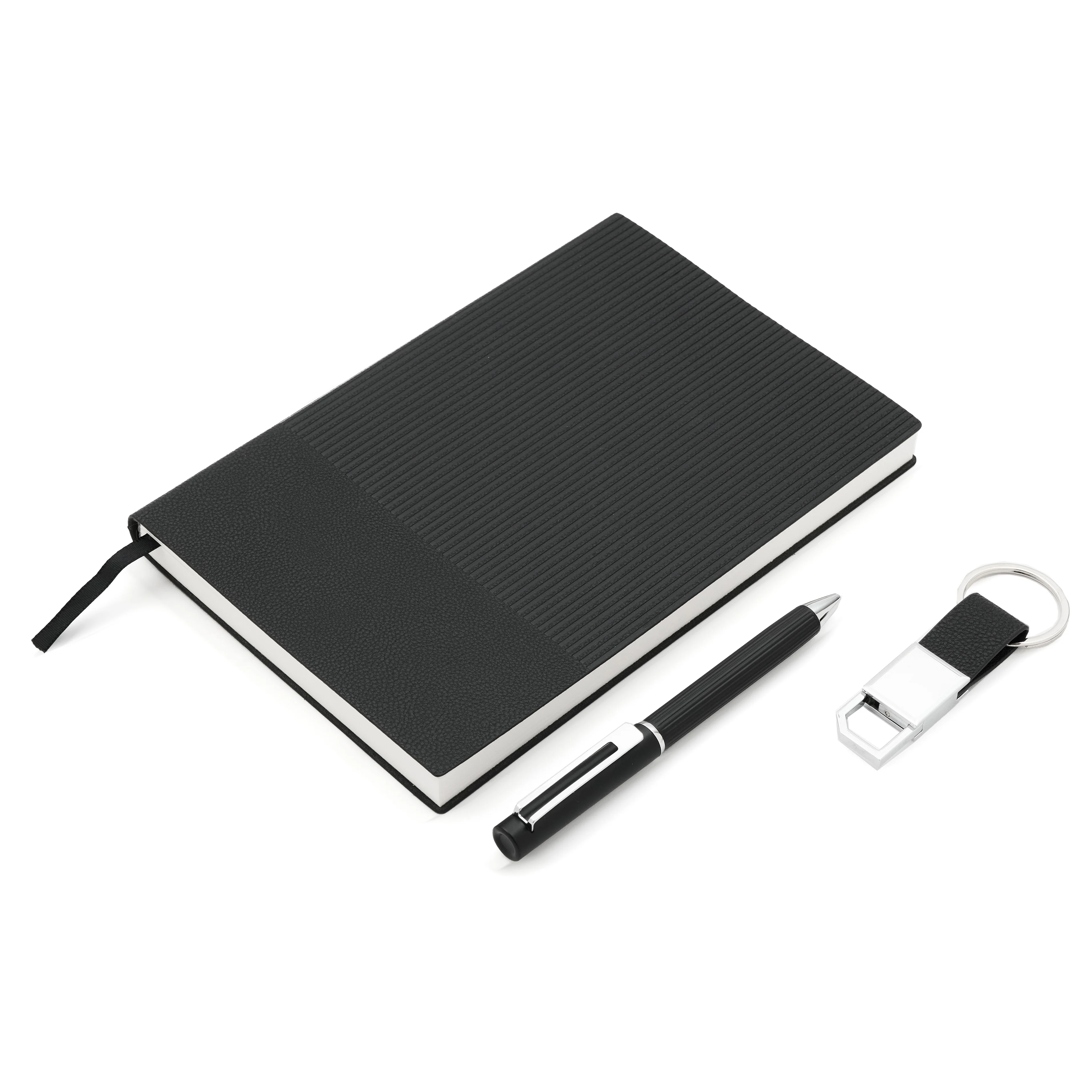 Elegante set que incluye un cuaderno A5 rayado (80 g, 100 hojas, 21 x 14 cm), un lapiz de tinta azul y un llavero, todo presentado en una caja negra mate con correas para transportar fácilmente. Es un producto ideal para regalar en eventos corporativos o fechas especiales.