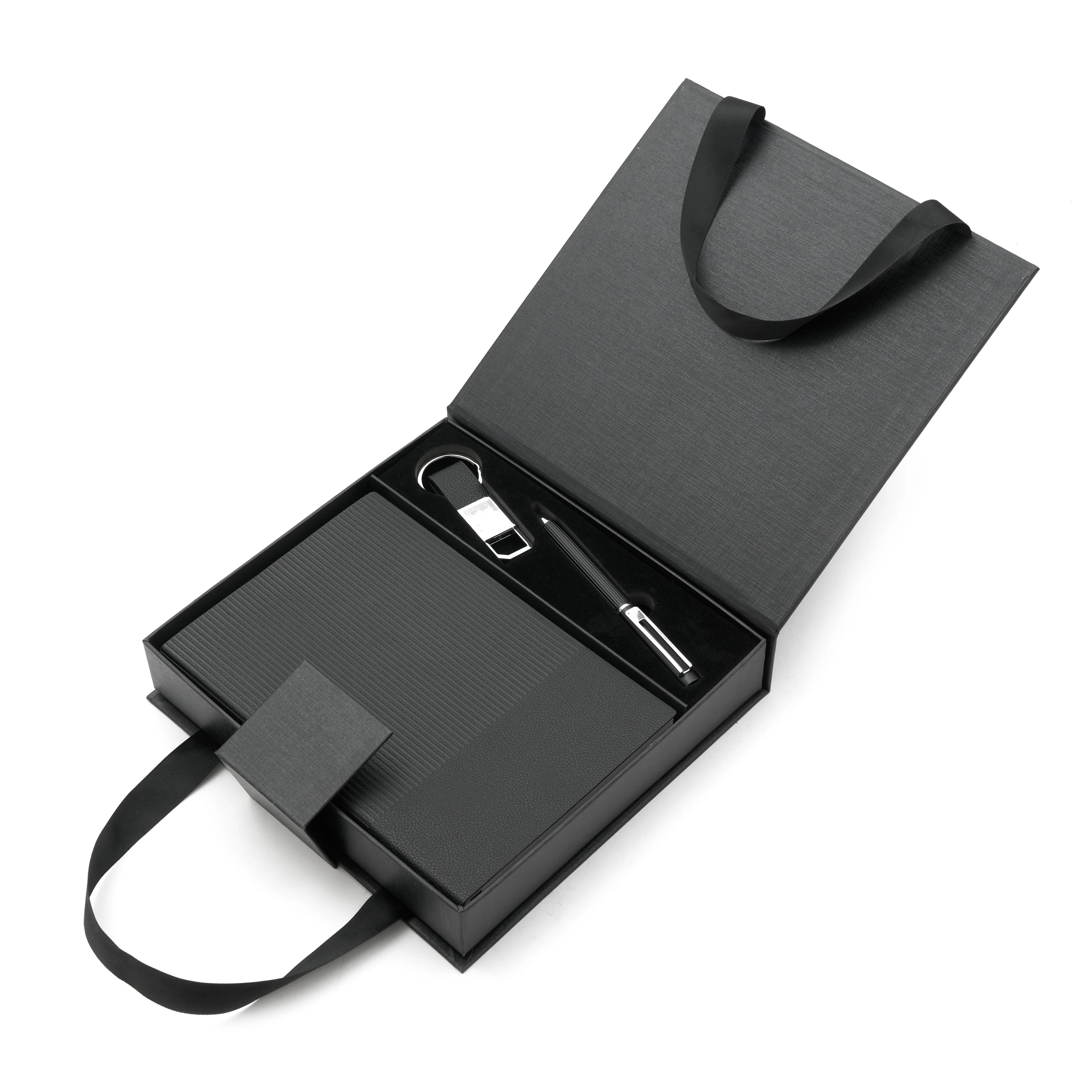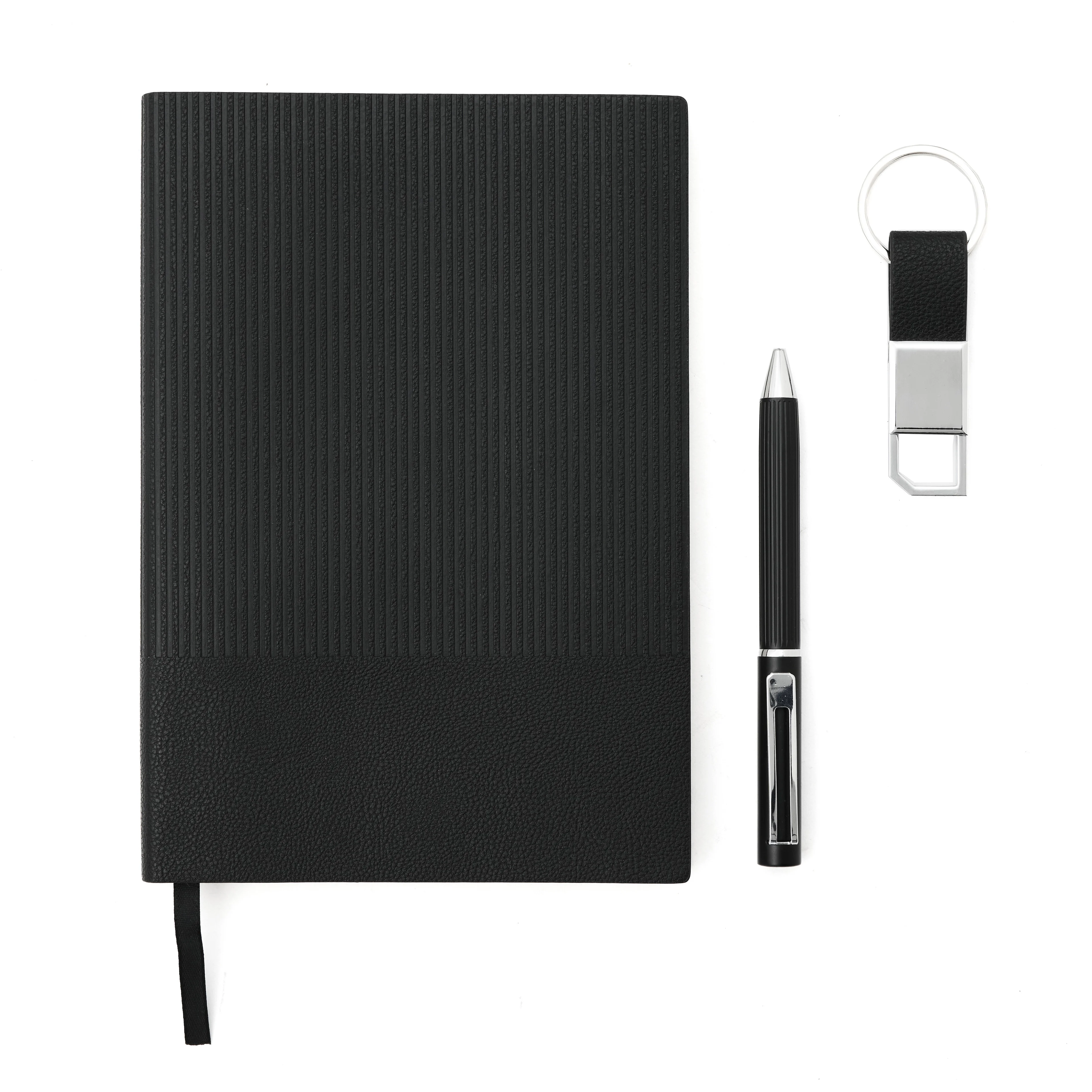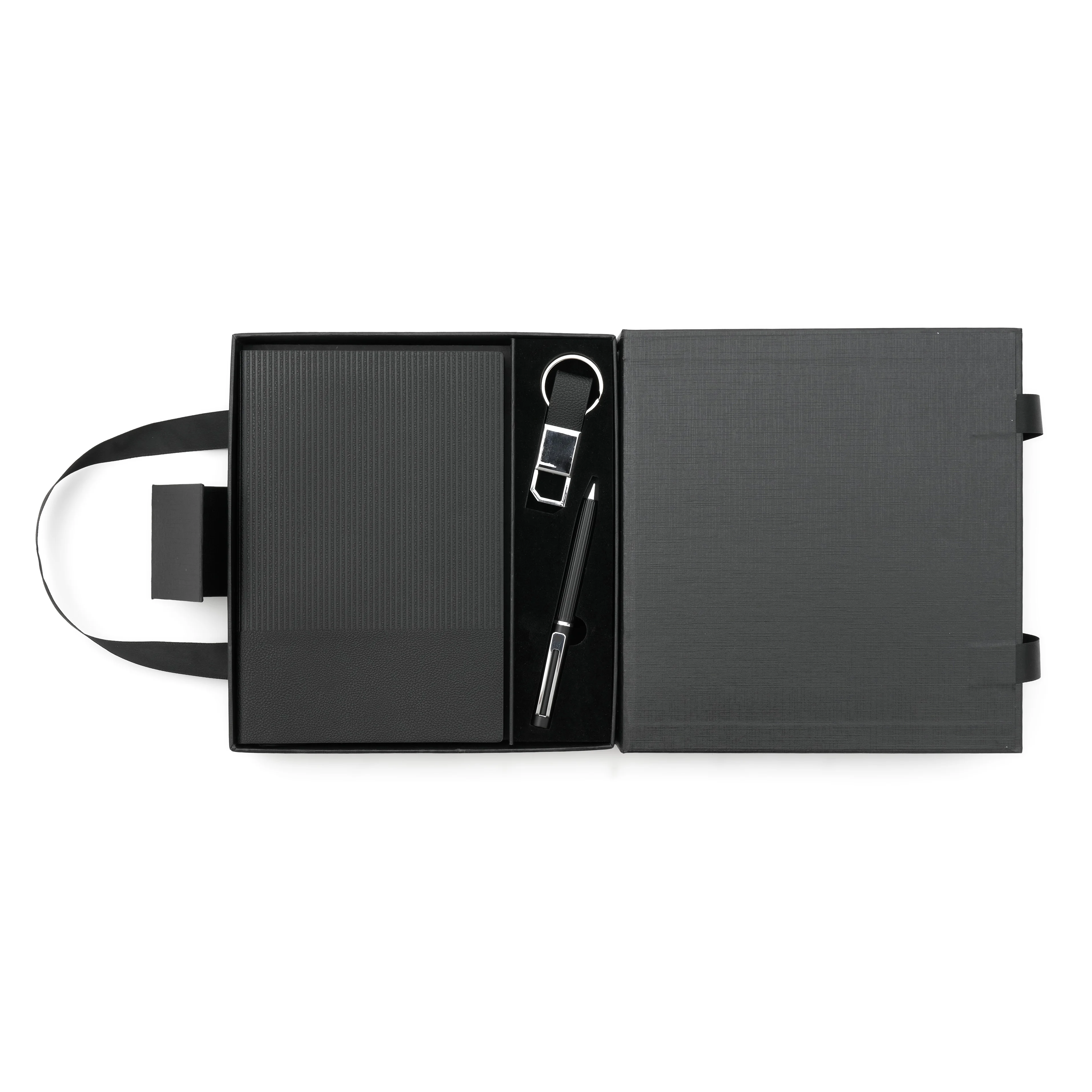 Elegante set que incluye un cuaderno A5 rayado (80 g, 100 hojas, 21 x 14 cm), un lapiz de tinta azul y un llavero, todo presentado en una caja negra mate con correas para transportar fácilmente. Es un producto ideal para regalar en eventos corporativos o fechas especiales.