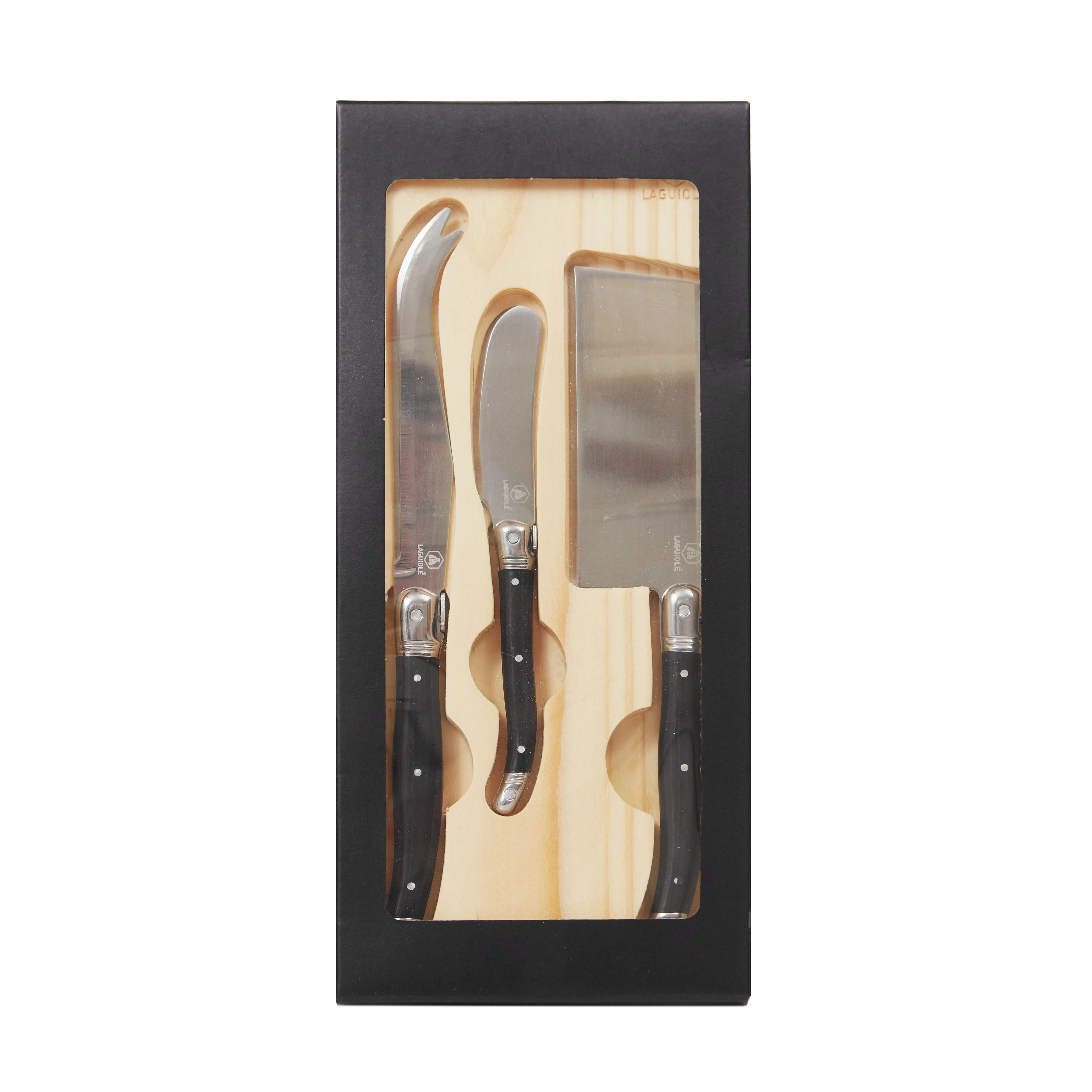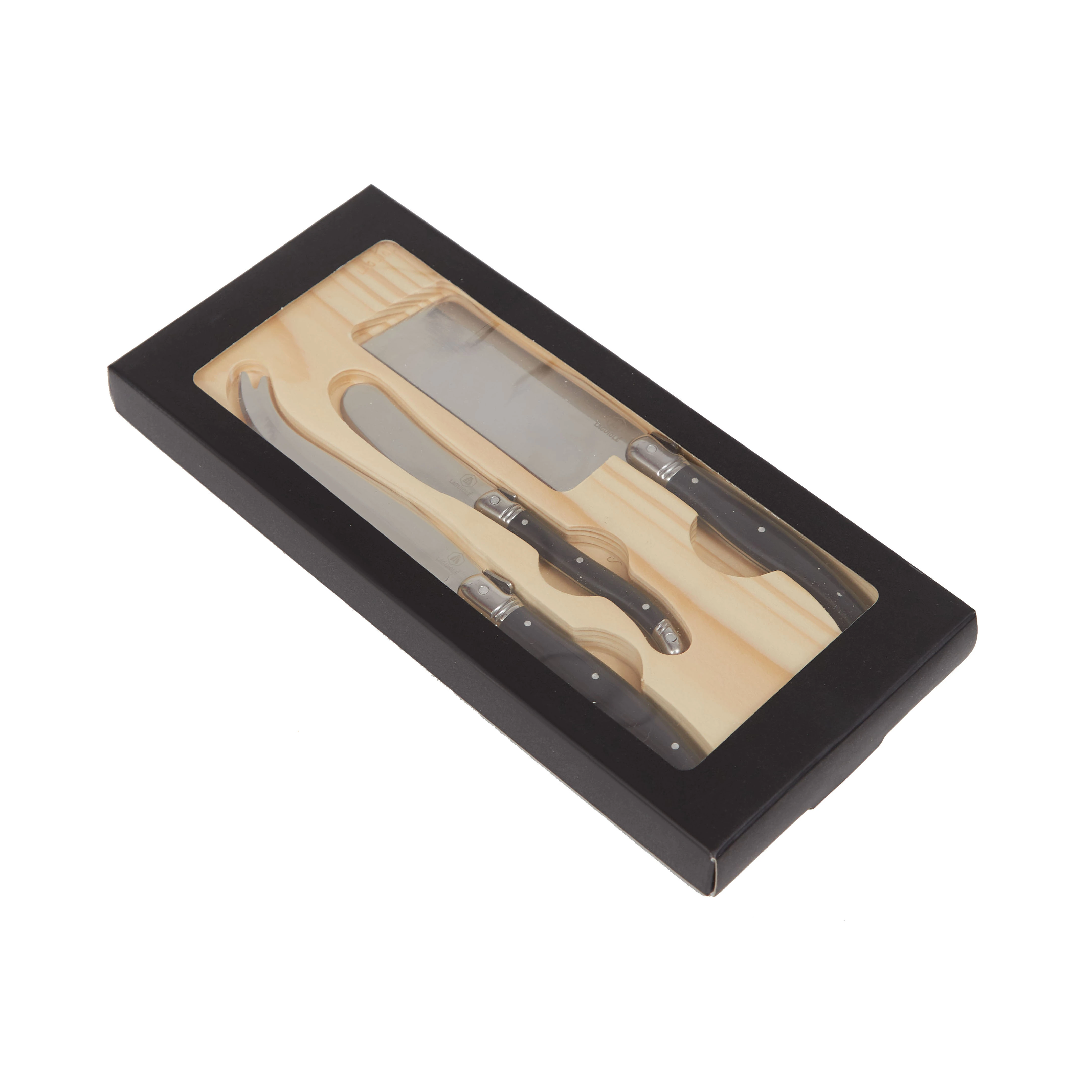 Set de queso de diseño francés con 3 utensillos de distintos tamaños. Los mismos vienen en una cuna de madera. Packaging: caja rígida de cartón laminada, la cual posee una ventana de cristal PVC. Medidas de la caja: 31 x 16 x 6 cm. Producto libre de BPA. Laguiole.