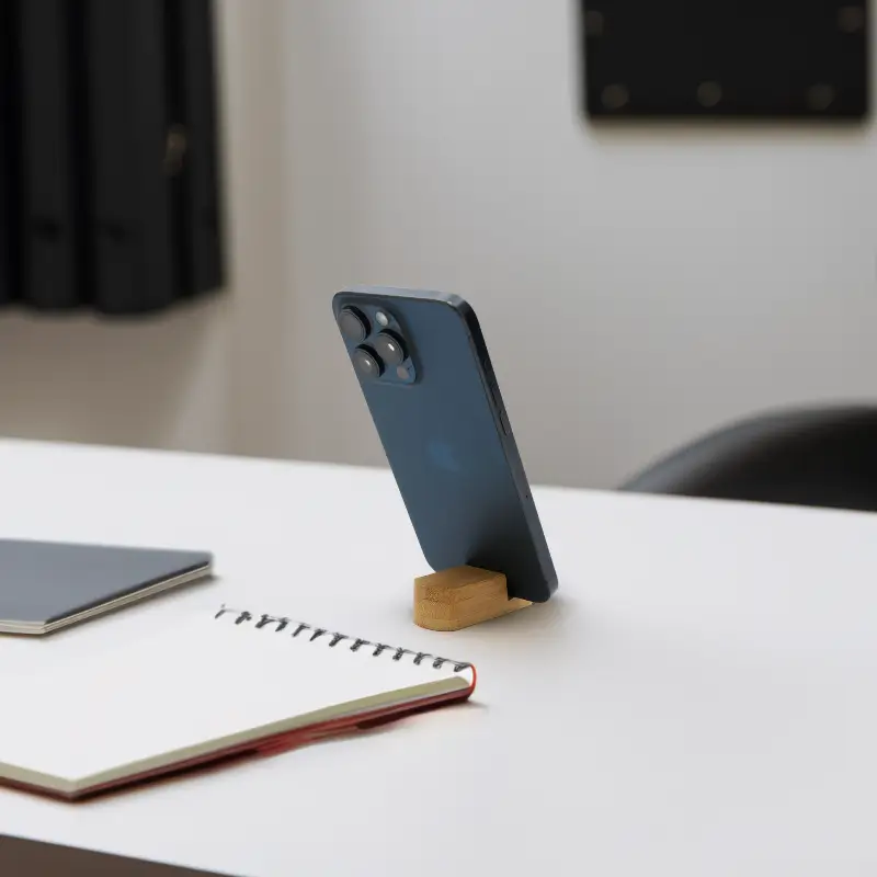 Soporte de escritorio para celular fabricado en bambú.