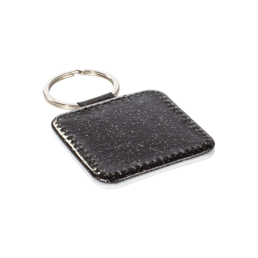 Llavero cuadrado de PU blanco para sublimación. Reverso capa PU negro con brillo (no sublimable). Argolla de Acero inoxidable.
