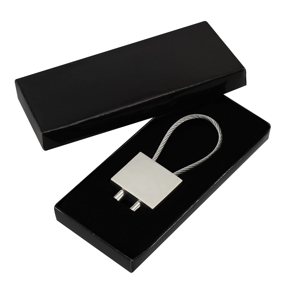 Llavero Metálico modelo "Candado". Presentación en estuche laminado negro con cuna aterciopelada.