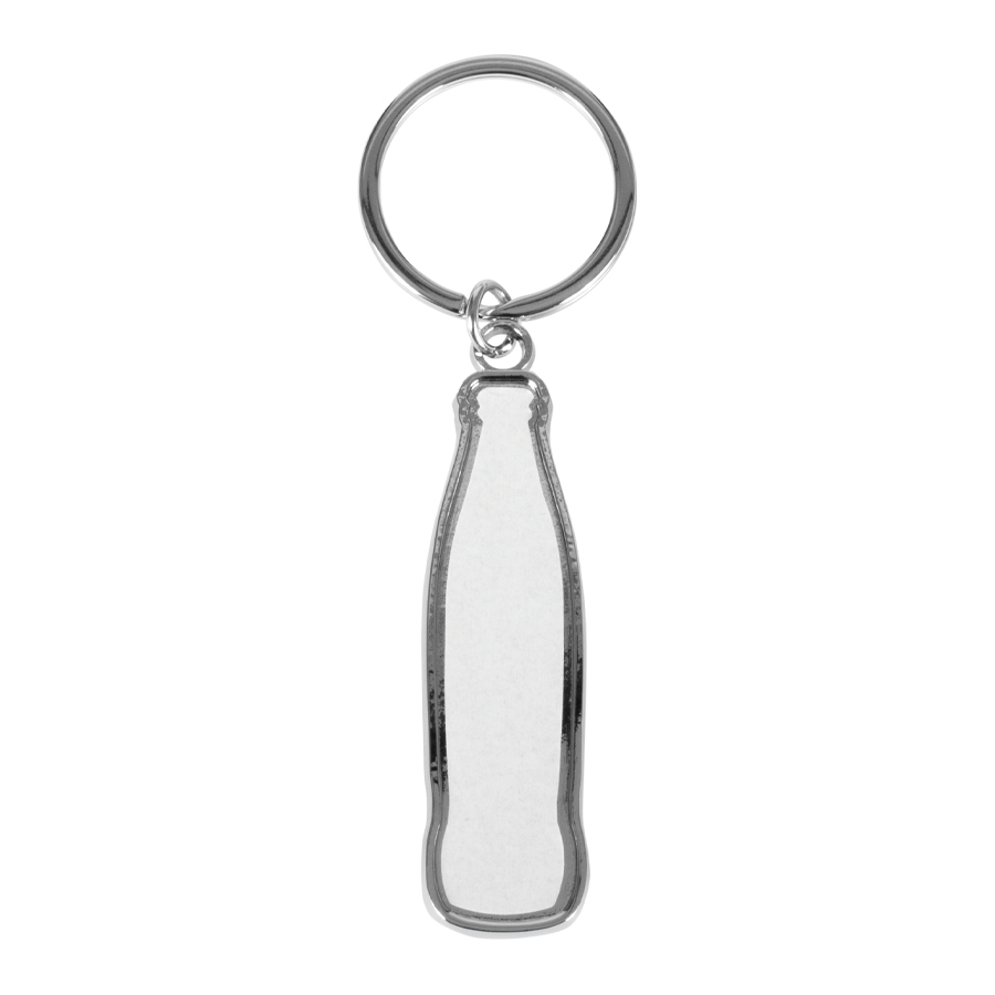 Llavero-destapador metálico con forma de botella de bebida gaseosa, para Sublimación. Incluye argolla llavero de Acero inoxidable. Presentación en estuche negro con cama aterciopelada negra.