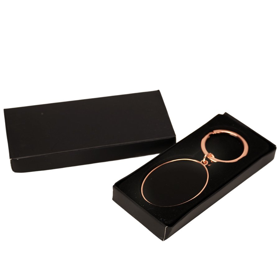 Llavero metálico ovalado de zinc alloy encobrizado, con placa interior de aluminio negro. Presentación en elegante estuche laminado negro mate, con cuna aterciopelada negra.