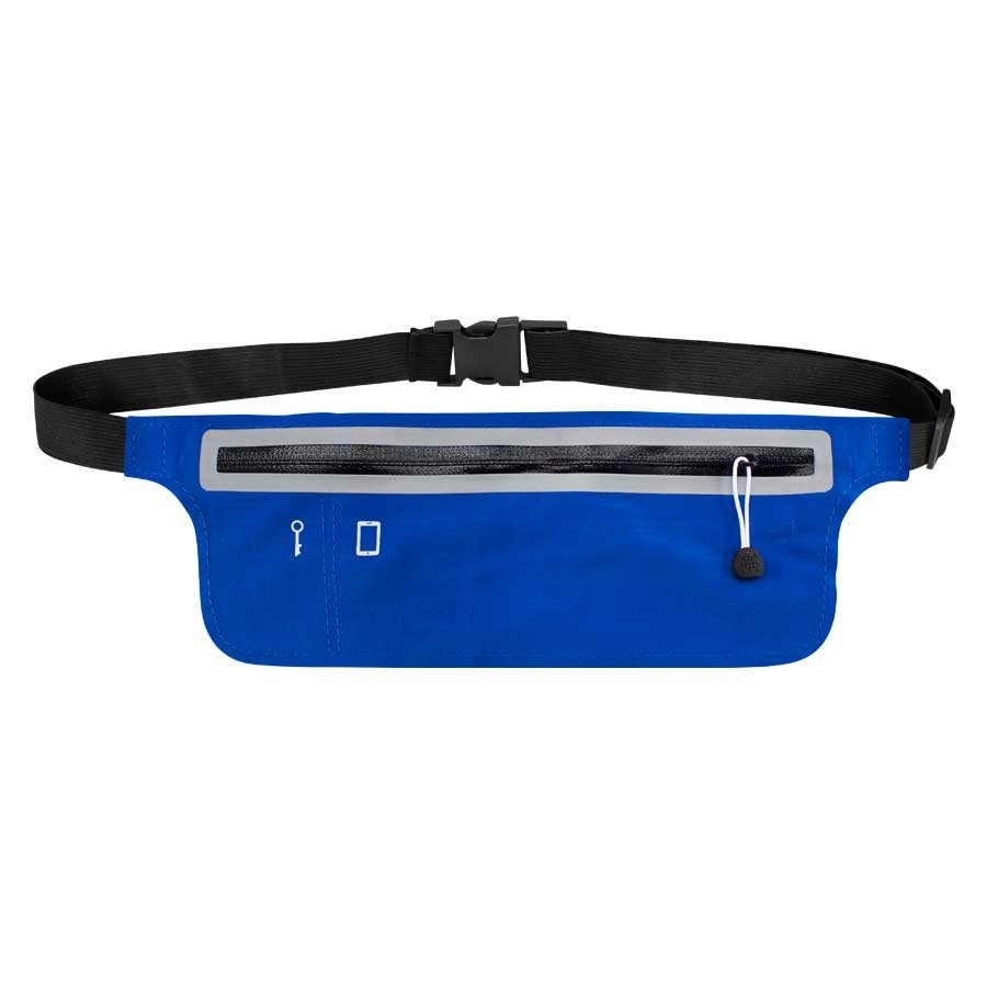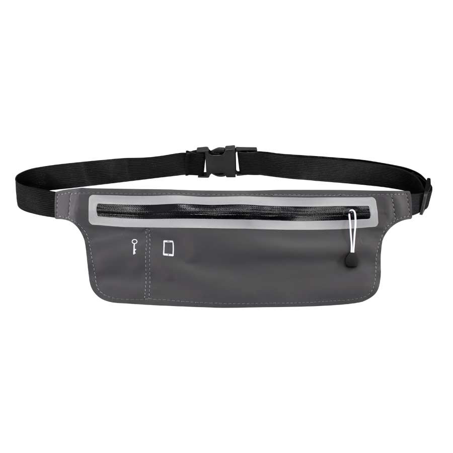 Banano impermeable, en tela Polyester Stretch 210 Waterproof. Incluye banda-cinturón elasticado ajustable color negro, bandas reflectantes color plateado, cierre-eclair impermeable y doble compartimento, uno para smart-phone, otro para accesorios como llaves o monedas.