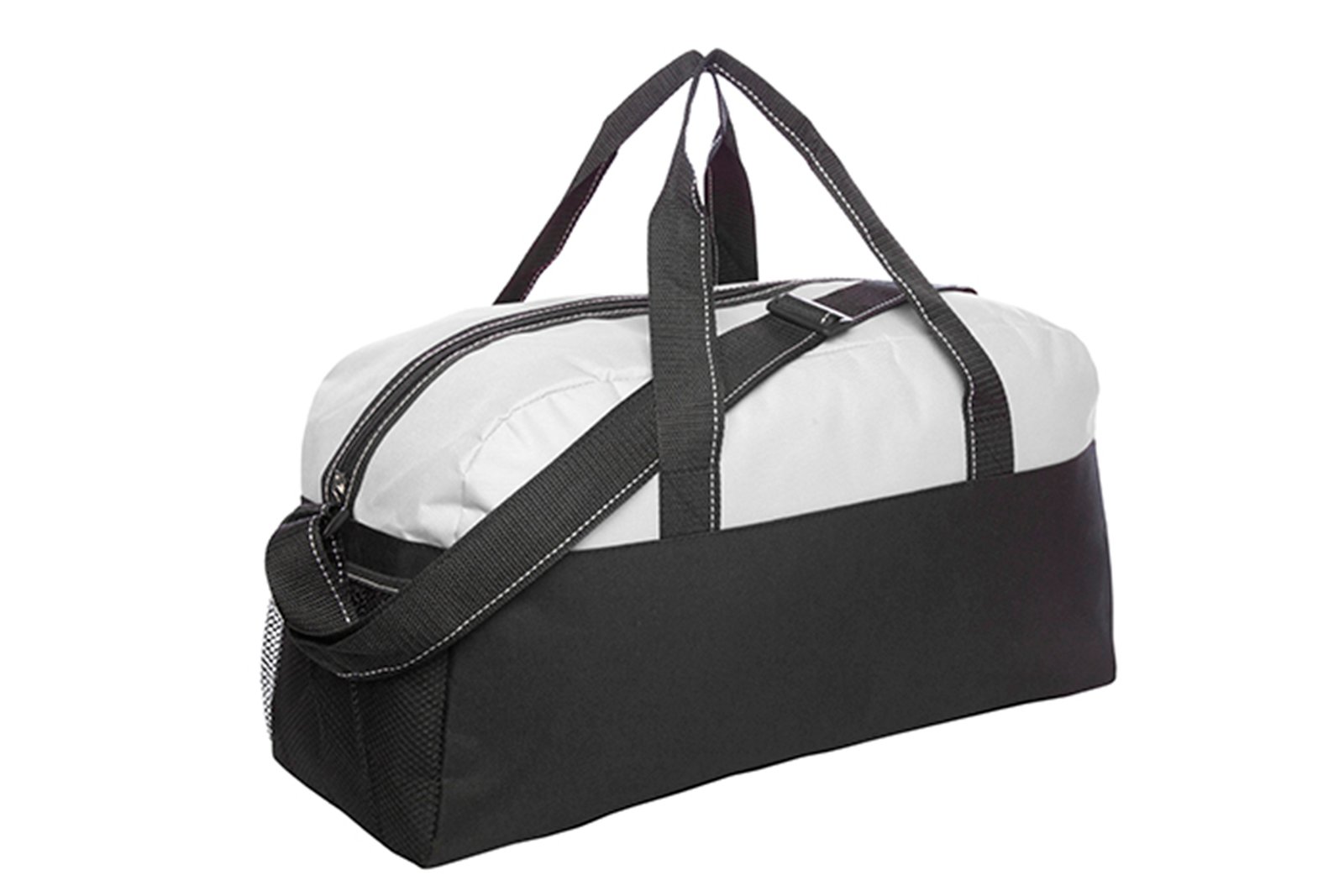 51 x 18,5 x 25 cm. Capacidad 23 litros aprox. Poliéster 300D. Bolso con bolsillos de redes en los laterales. Dos manijas, correa ajustable y cierre principal con vivos en color blanco.