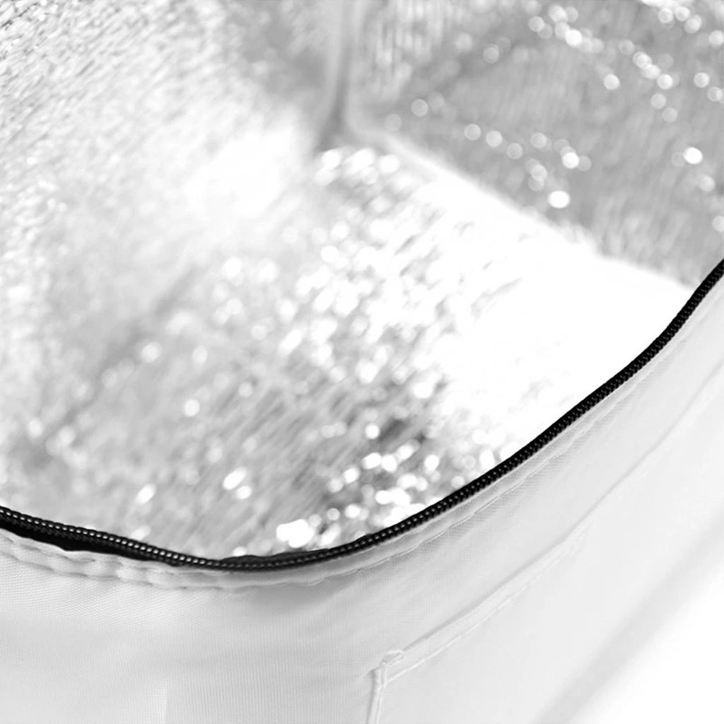 Realizado en su exterior en polyester 210T y su interior en aluminio y PE Foam 2mm. Cuenta con tira para colgar al hombro y bolsillo frontal sin cierre.