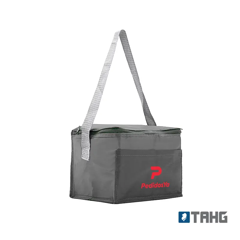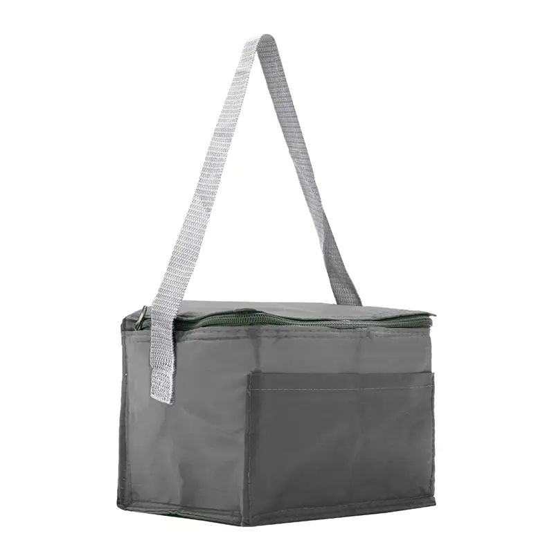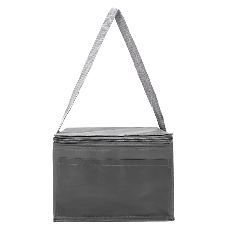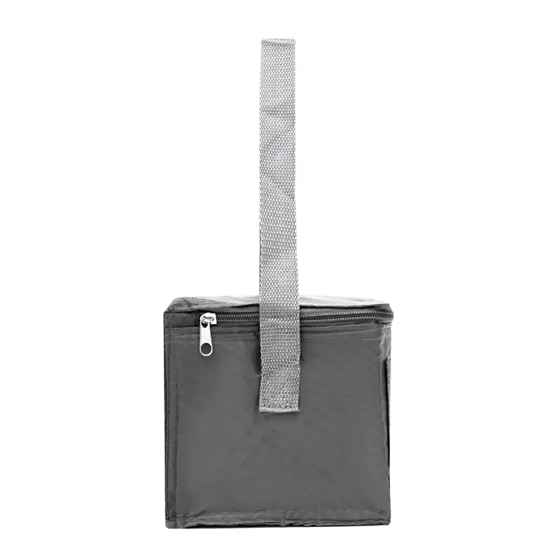 Realizado en su exterior en polyester 210T. Interior en aluminio y PE Foam 2mm. Tiras para hombro. Compartimiento principal superior. Bolsillo frontal. Medidas: 20,3 x 15,2 x 15,2 cm. Capacidad 5 Lt.