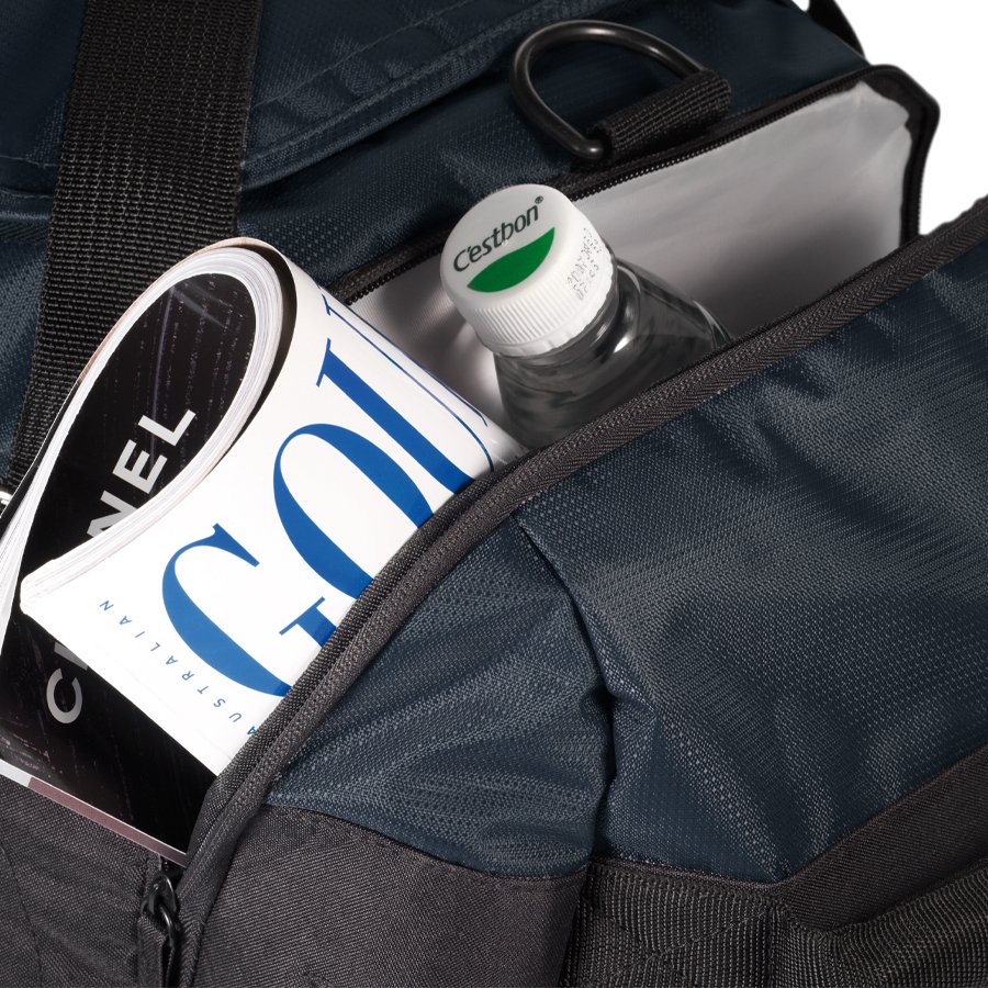 Bolso viaje-deportivo tela impermeable polyester 840D, interior reforzado EVA, 2 bolsillos laterales, 1 bolsillo frontal, compartimento para zapatos, cinta de colgar con hombrera acolchada y cordón elástico multiuso.