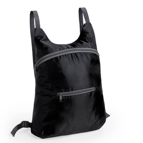 SK24 Negro SK25 Azul SK26 Roja Mochila plegable en suave poliéster 210D de color Negro, con cierre de cremallera, bolsillo frontal y salida de auriculares. Con esquinas reforzadas, cintas de hombro regulables y accesorios en color gris. Plegado de pequeño tamaño con cinta de transporte. Otros colore…