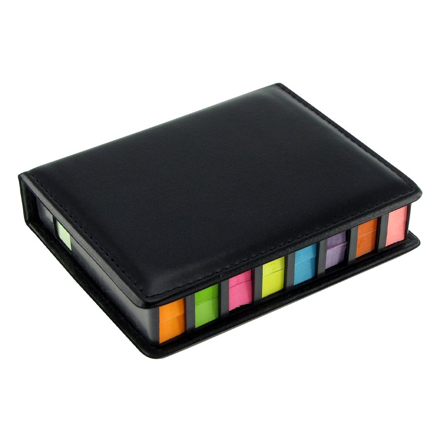 Memo Set de PU negro con notas y banderitas adhesivas. Incluye 200 notas adhesivas rectangulares + 200 notas adhesivas cuadradas + 1.600 banderitas adhesivas de colores. Superficie de PU liso, ideal para impresión.