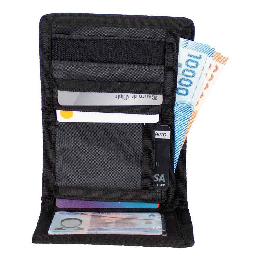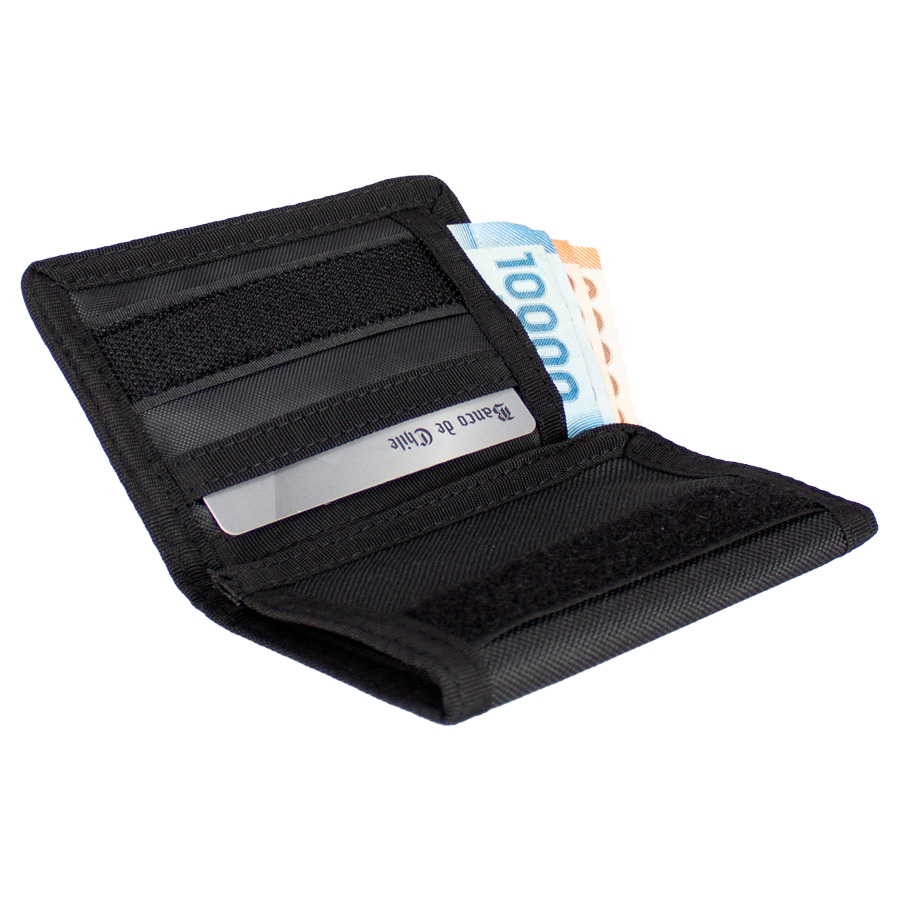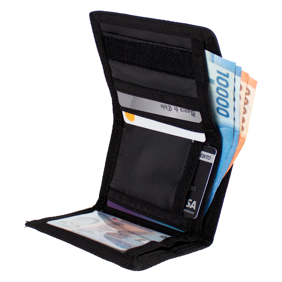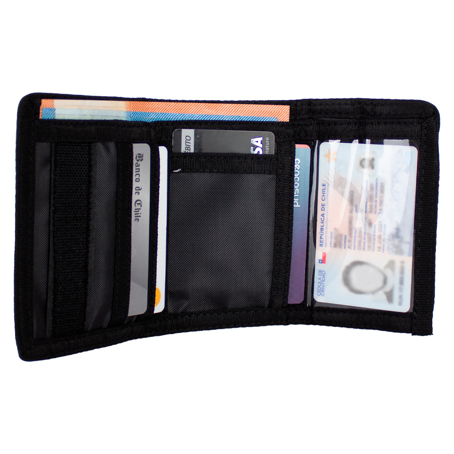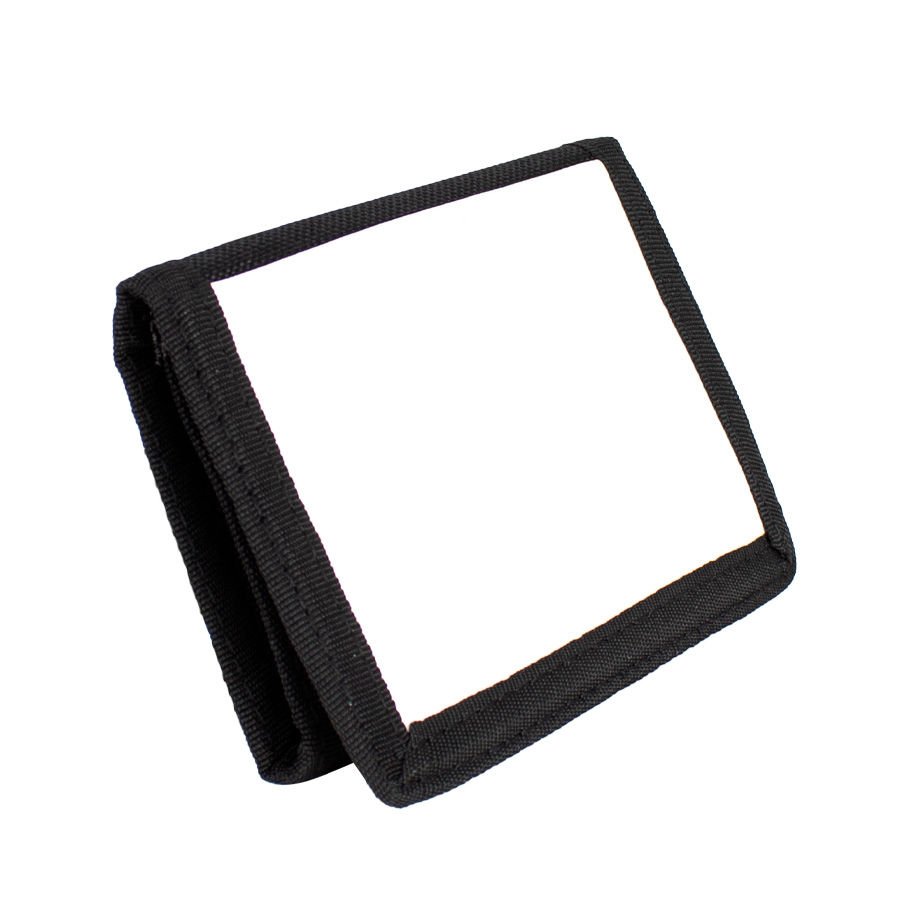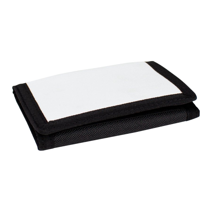 Billetera de nylon y poliéster color negro, con ventana de nylon blanco de 10.2 x 6.8 cm, para Sublimación. Presentación en bolsa PP translúcido.