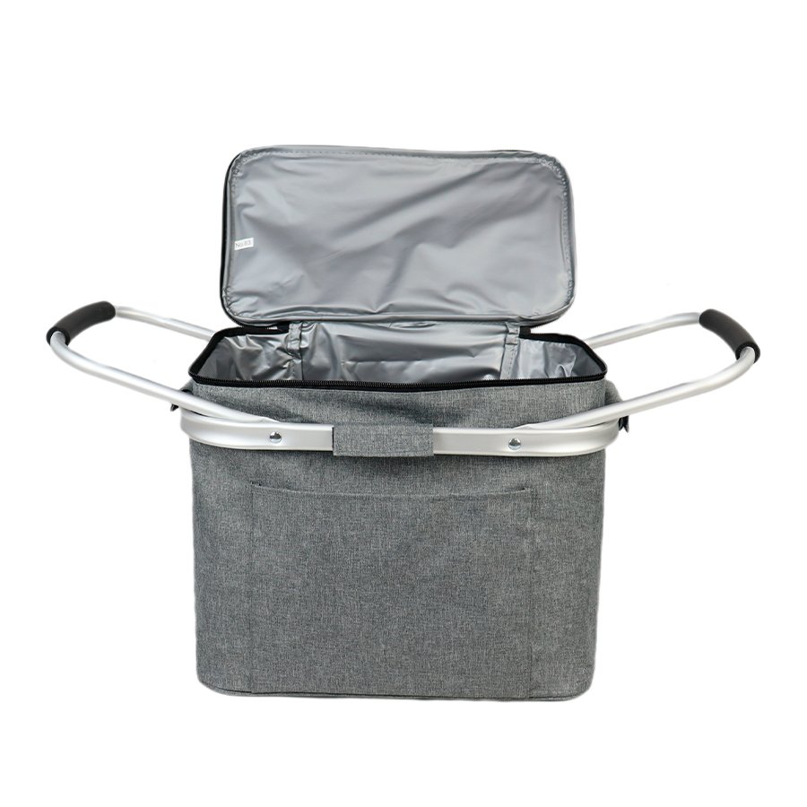 Bolso cooler grande de 23 litros de capacidad, en tela poliéster 300D/PVC. Montado sobre estructura de aluminio con asas plegables. Interior térmico aislante de PEVA y acolchado con esponja PE FOAM.