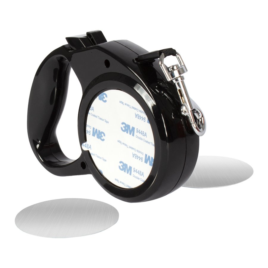 Correa extensible de 3mts para mascota, en plástico ABS negro, mosquetón de Acero inoxidable y correa de nylon color negro con sistema de traba. Contiene 2 compartimentos circulares y 2 placas metálicas blancas, para sublimar y pegar en ambos lados del producto.