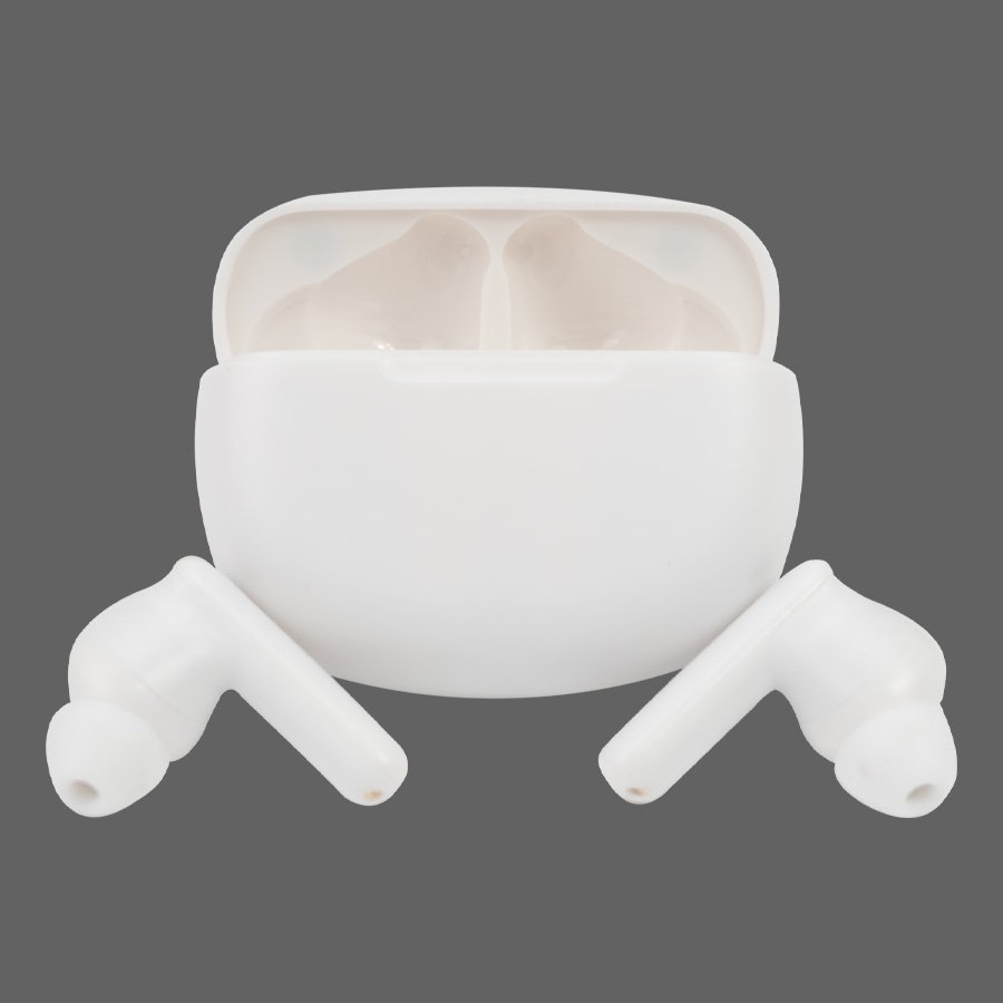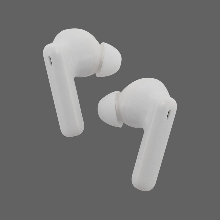 Audífonos auriculares inalámbricos, función Bluetooth Touch ID, puerto Tipo-C, emparejamiento automático, incluye par de protectores de silicona y manual de instrucciones en inglés y español.