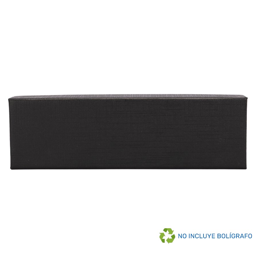 Estuche rectangular Porta-Bolígrafo ejecutivo modelo "TAURUS", con tapa. Fabricado en cartón forrado color negro, con base interior acolchada en tela negra afelpada y cinta sujeta-bolígrafo de poliéster. 100% color negro.