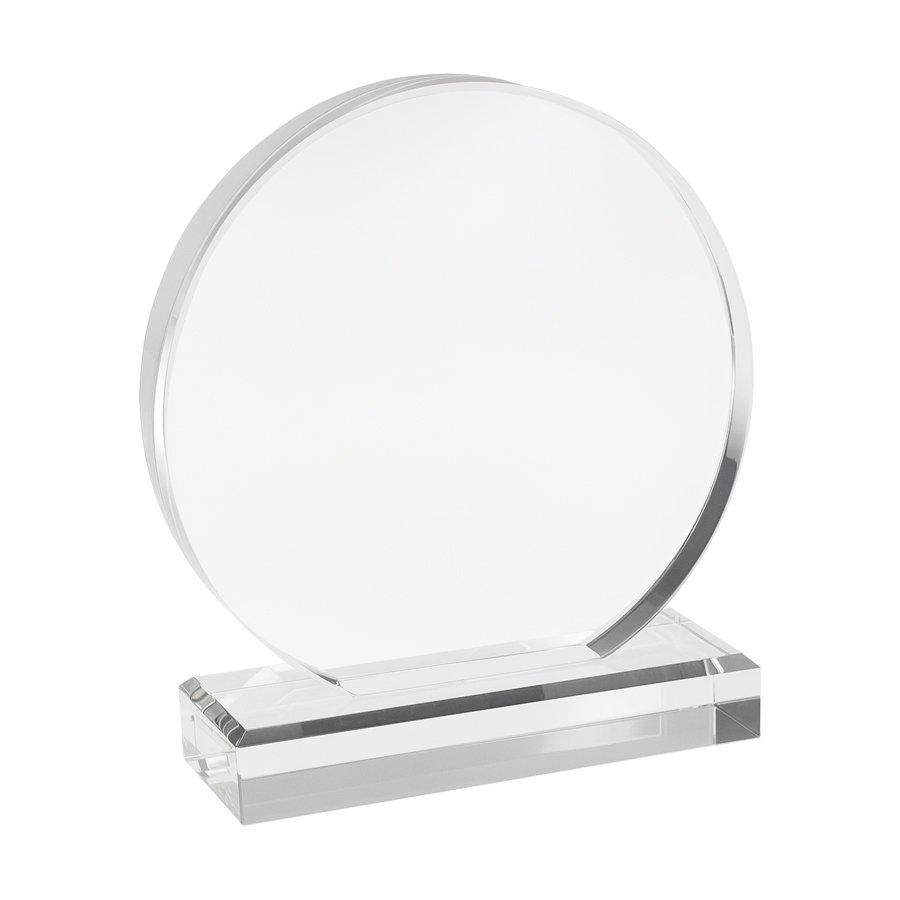 Trofeo de Cristal modelo "Circle" con base. Presentación en caja de cartón forrado negro.