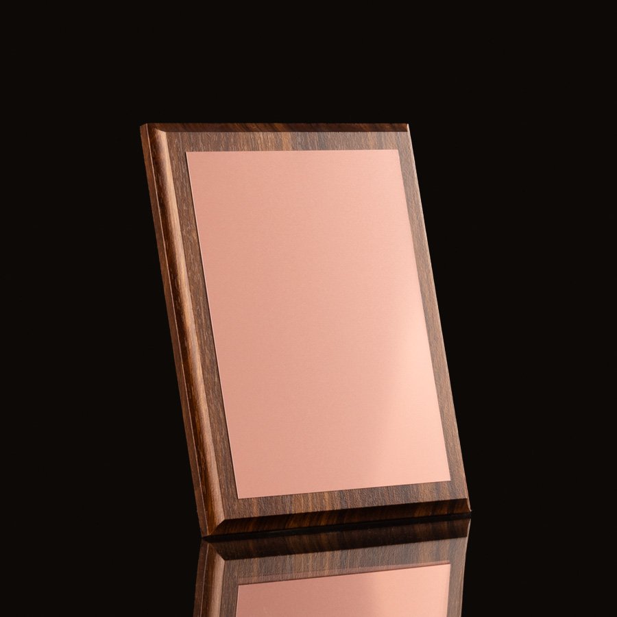 Placa metálica color cobre, modelo "STUDIO", montada sobre base rectangular de madera barnizada con cantos troquelados. En su parte posterior, incluye orificios y soporte metálico para exhibición vertical u horizontal. Presentación en caja de cartón forrado negro con cierre imantado, interior acolchado de espuma y tela poliéster satinado negro, con troquel. OJO: la placa metálica viene con film plástico removible, para protección de la misma.