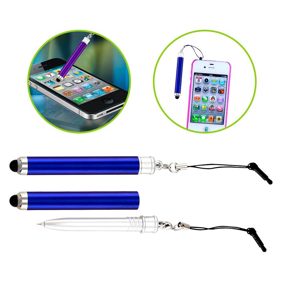 Bolígrafo "Touch-Screen" con cuerpo plateado, tapa de color metalizado y goma posterior negra para pantalla táctil. Incluye práctico soporte plástico para insertar en la salida de auricular del iPhone. Escritura azul.