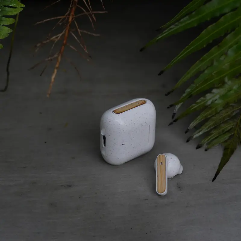 Auriculares inalámbricos fabricados en bambú, ABS y Wheat Straw, pasta de tallo de trigo, un material sustentable que reduce el consumo de plásticos vírgenes. Cada auricular cuenta con un botón touch que permite: contestar y finalizar llamadas, reproducir y pausar música, cambiar a la siguiente o anterior canción, subir y bajar el volumen y acceder al asistente de voz.