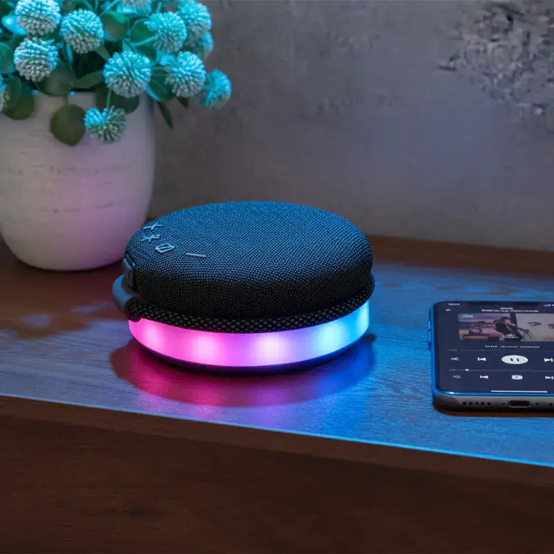 El parlante Fullmoon cuenta con luces led multicolor y una correa ajustable para que lo lleves a donde quieras. Está fabricado en ABS y silicona, con un recubrimiento de tela.