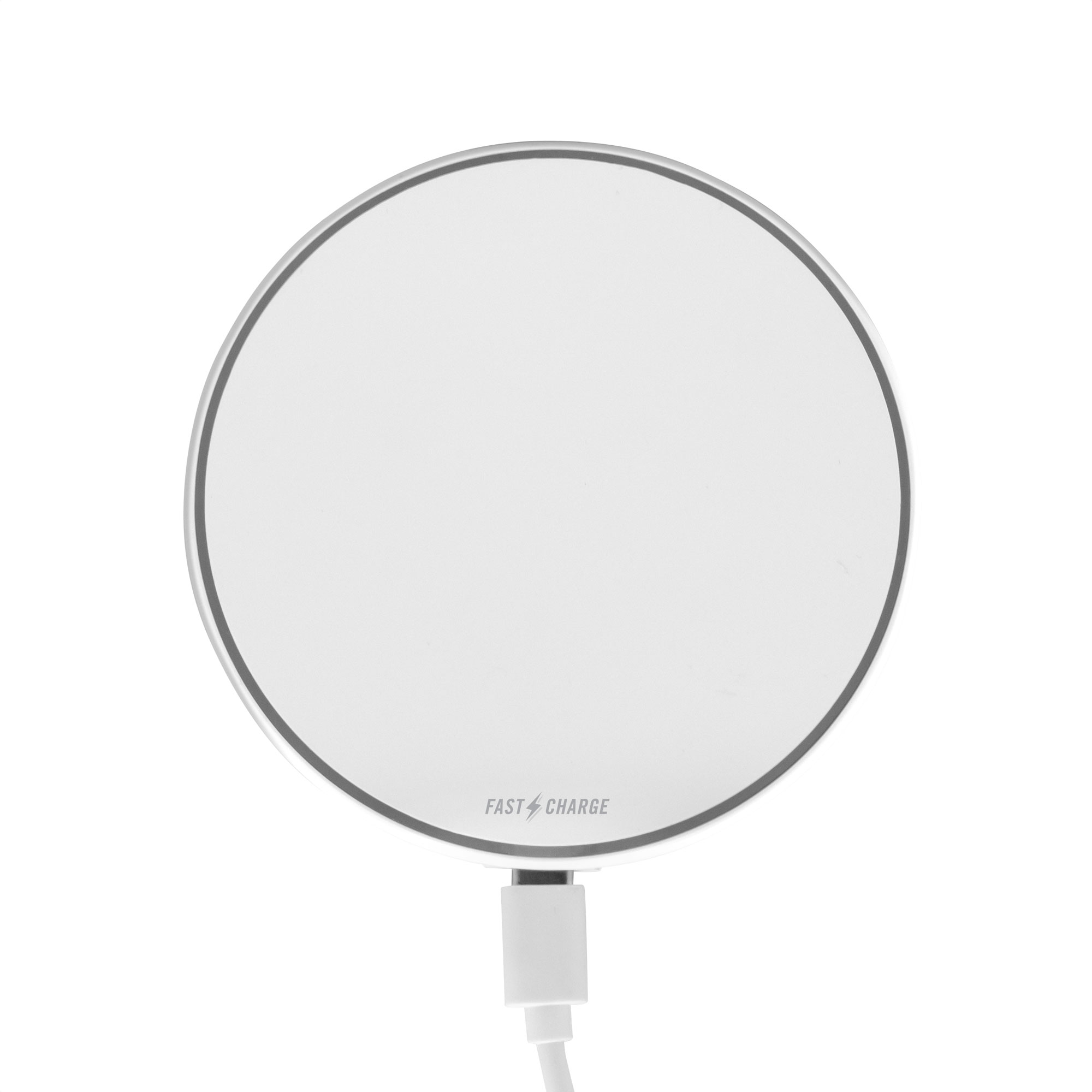 Ø 9,7 x 0,9 cm. Plástico ABS. Cargador inalámbrico con luz. Base plástica color blanco con antideslizantes. CARGA RÁPIDA. Salida: 15 watts. Luces indicadoras de carga. Cable de carga USB-C en color blanco de 50 cm de largo. Compatible exclusivamente con celulares que permitan carga inalámbrica (tecn…
