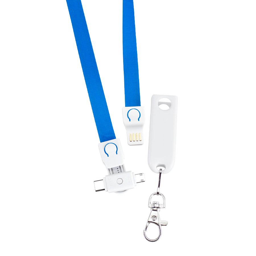 Connect Lanyard Multicargador, con terminal de carga USB y multicables Micro USB / Lightning / Type C. Incorpora nueva tecnología de cable cargador dual Micro USB y iPhone (en el mismo terminal). Compatible con dispositivos Android, Apple y Type C. Lanyard de poliéster de 90 x 1.3cm. Terminal plásti…