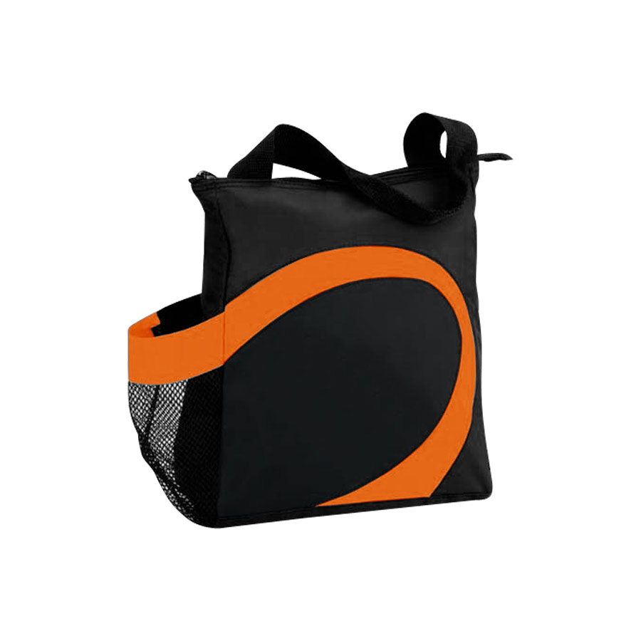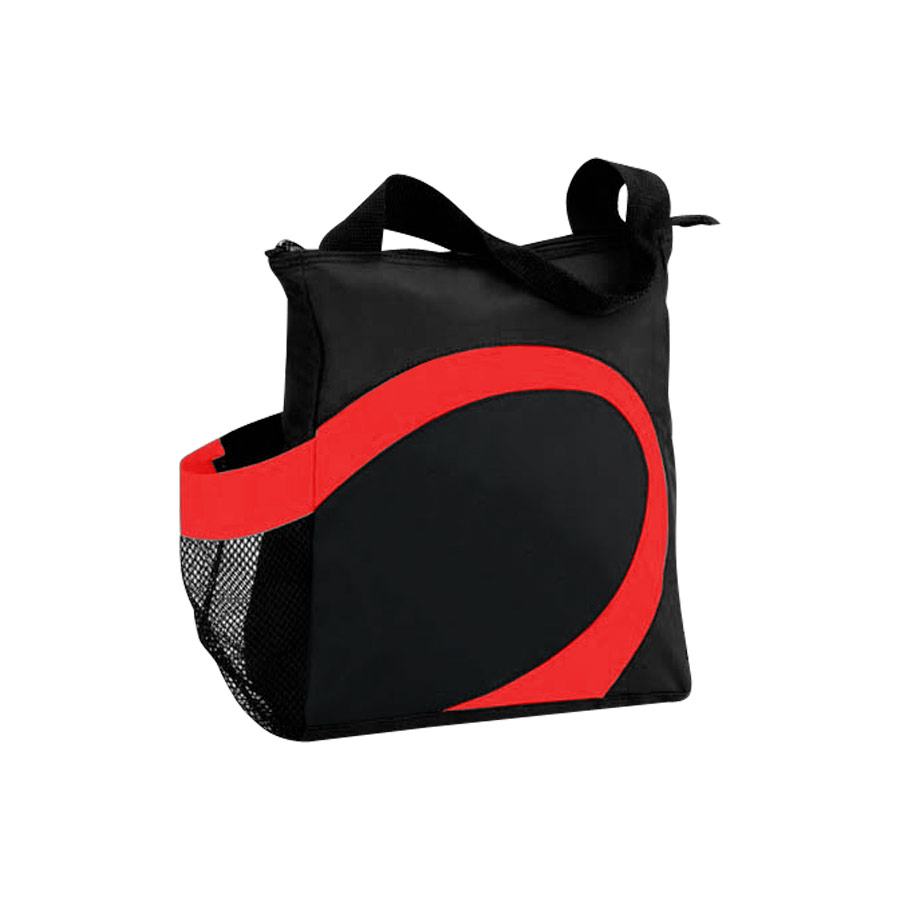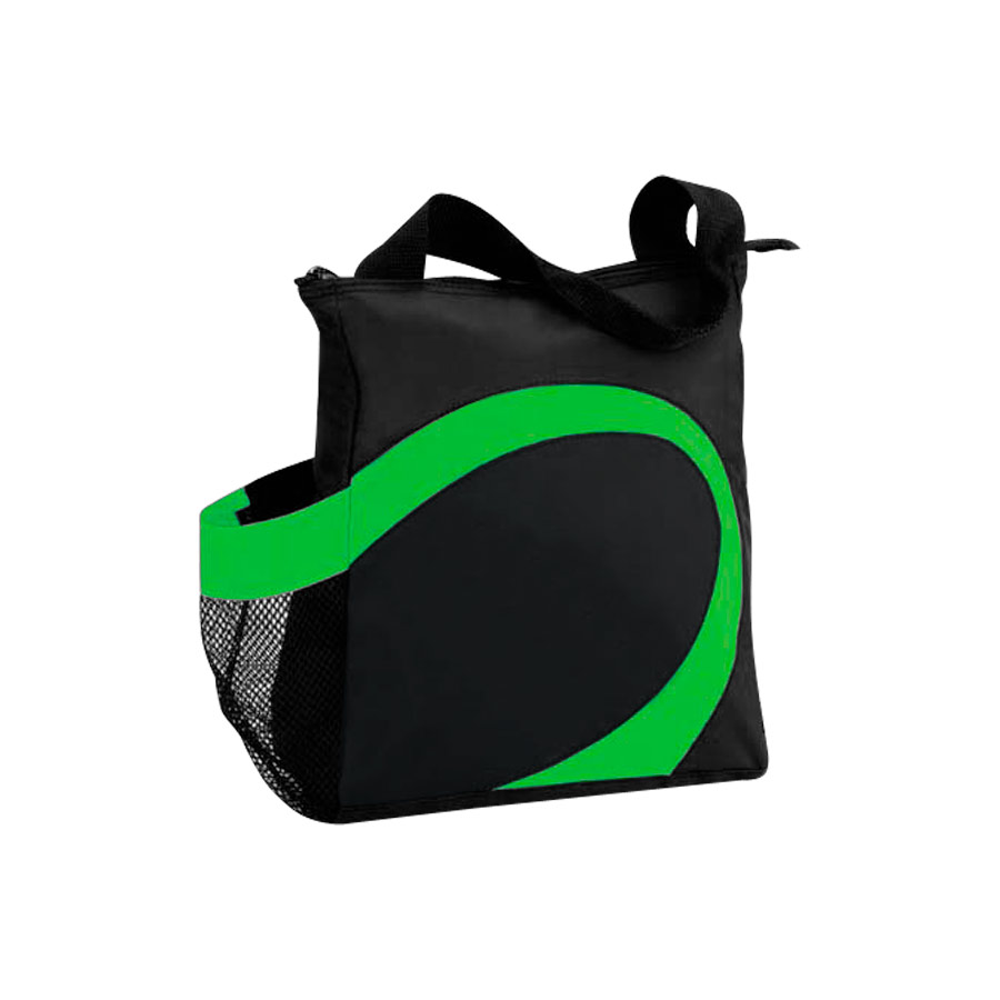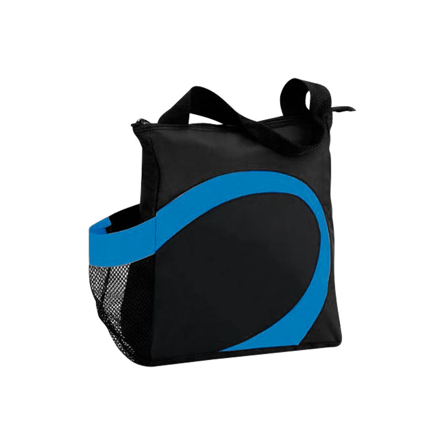 Cooler modelo "Wave". Tela exterior Polyester 70D/PVC. Tela interior plateada aislante 15C PEVA + relleno 3mm esponja PE. Cierre cremallera superior. Incluye bolsillo lateral en tela malla.
