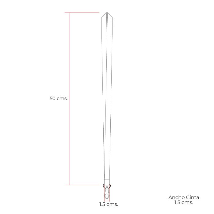 LAN 03 Cinta lanyard simple de poliéster texturada. Largo Colgante 2 x 50 cms. Largo Broche / Cinta 10 cms. Ancho 1,5 cms. Espesor Cinta 1 mm. Embalaje 100 Unidades. Embalaje Master 1000 Unidades. Tamaño Caja Master 48 x 28,5 x 20 cms. Peso Caja Master 9,5 Kg. Opciones de Personalización