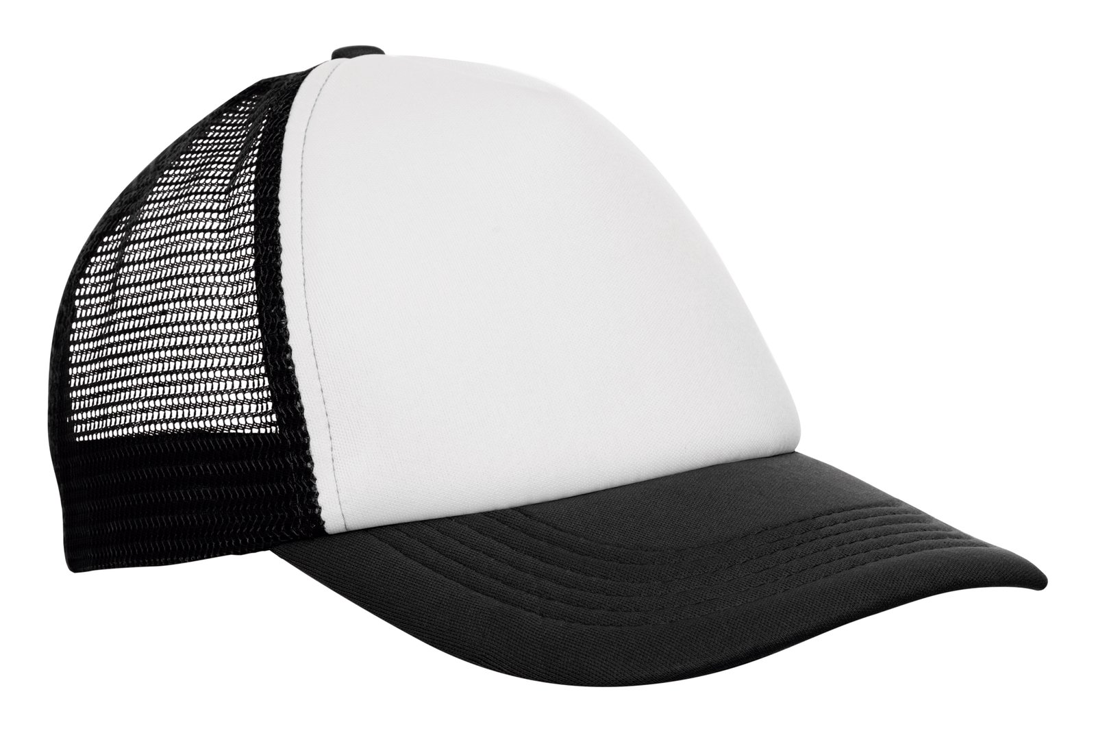 Ancho de base 18 cm. x alto 16 cm. Poliéster. Gorra trucker 5 gajos. Frente de color blanco. Parte trasera con tela red de color. Ajuste con broche plástico. Seis costuras 17,5 x 7,5 cm.