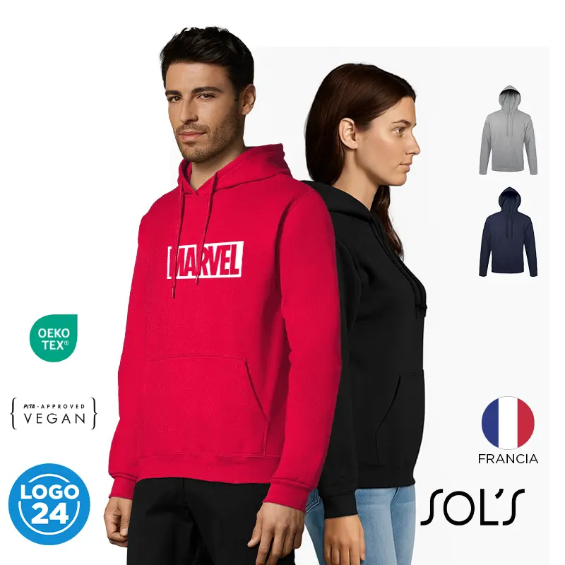 Polerón de frisa 50% algodón y 50% poliéster de 280g tipo canguro unisex con capucha.